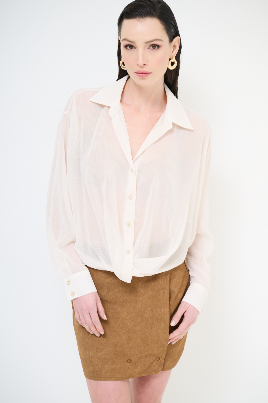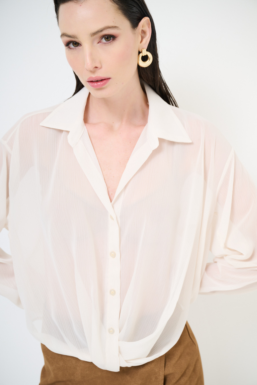 Semi-sheer georgette shirt with gathered puff hem, classic front buttoning and cuff with double button, rounded back hem