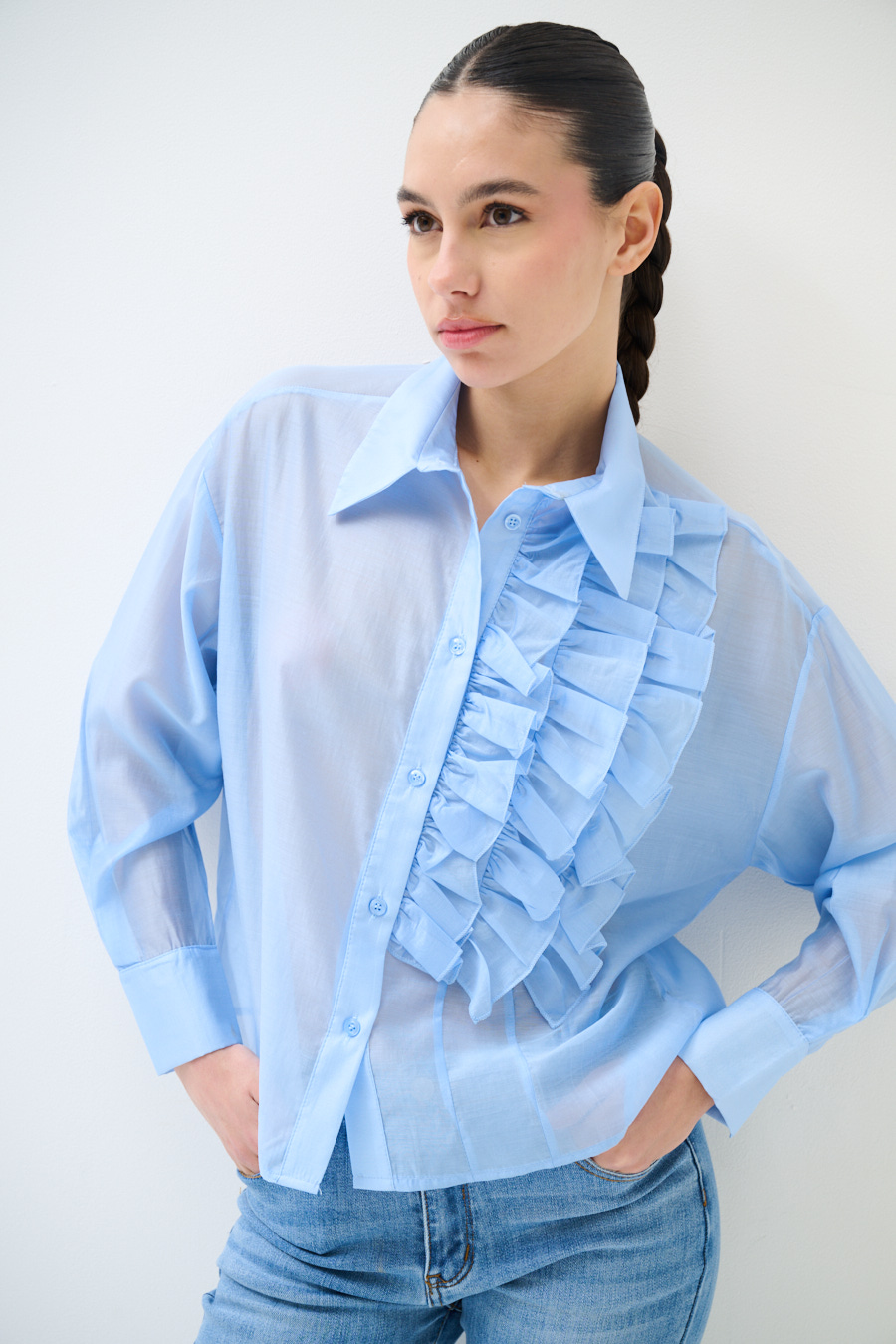 Semi-sheer shirt with center buttoning and ruffles on the front side