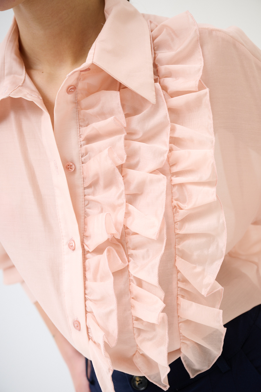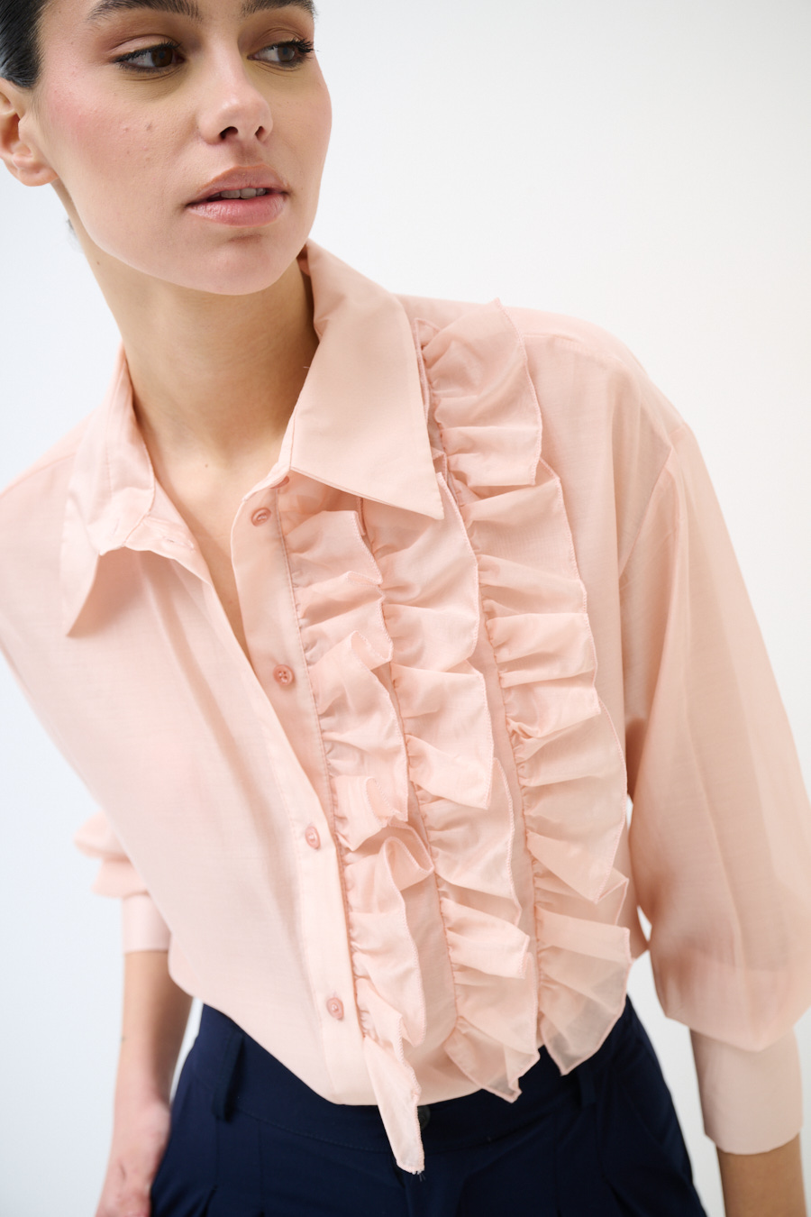 Semi-sheer shirt with center buttoning and ruffles on the front side