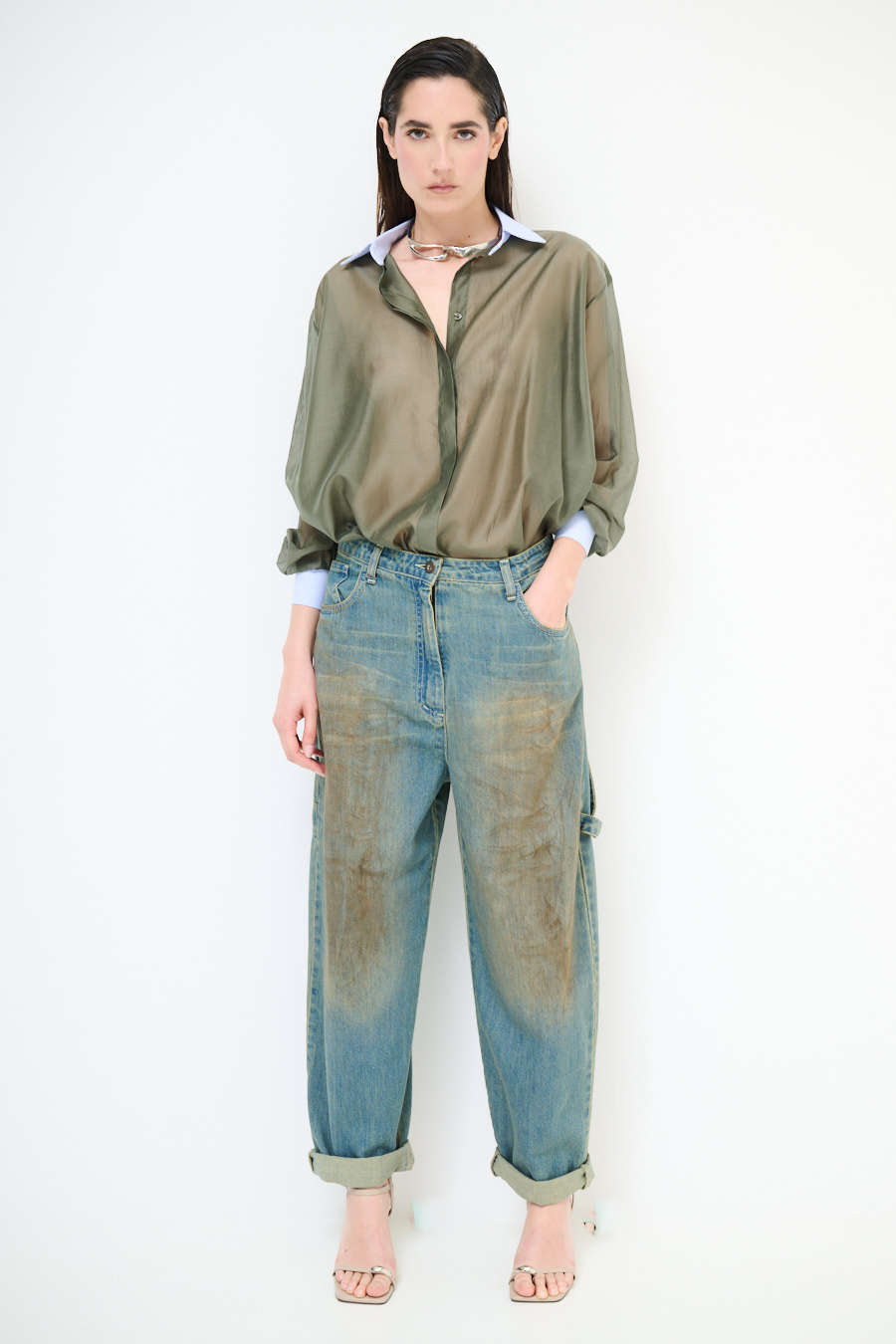 CAMICIA LYOCELL CON COLLETTO RIGATO VERDE MILITARE