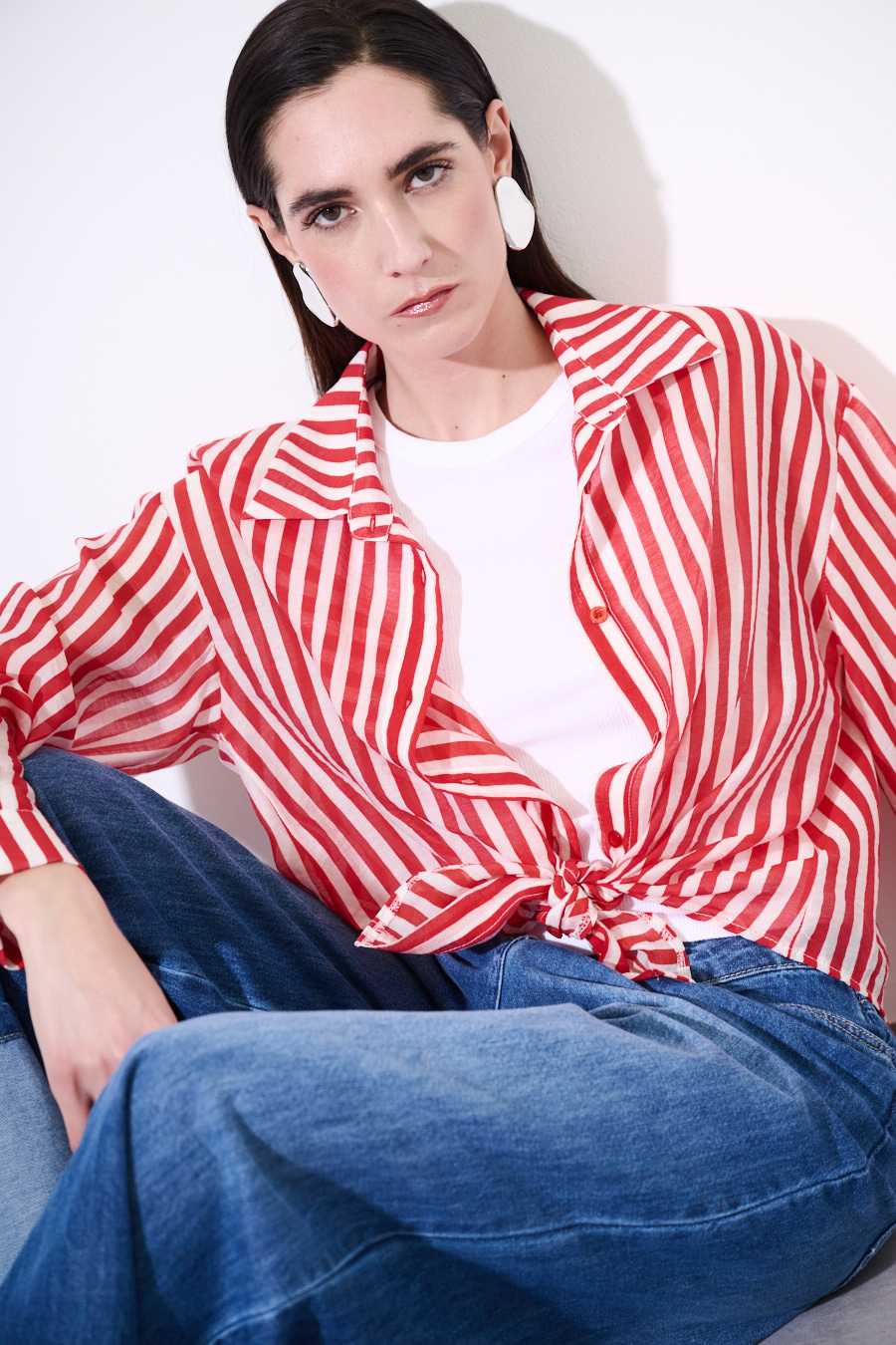 Oversized striped shirt with long sleeves, central button closure, and front knot