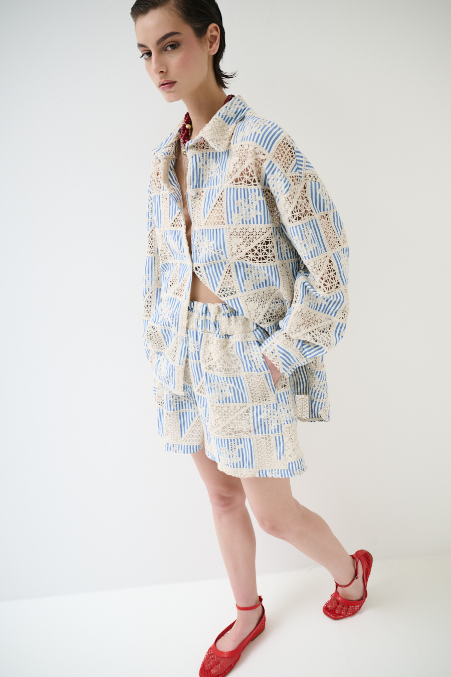 Striped over-shirt with dropped shoulder and macramé embroidery