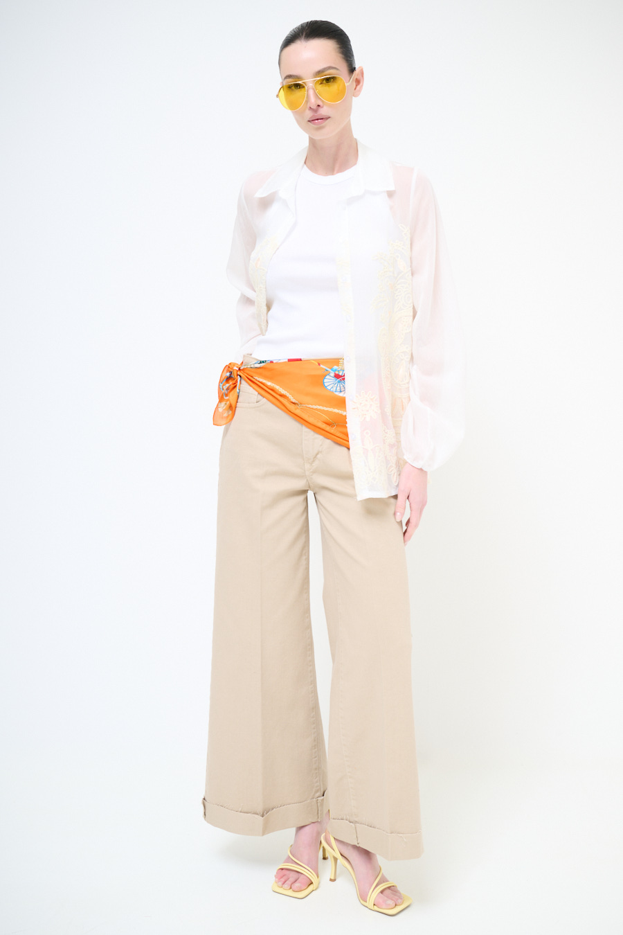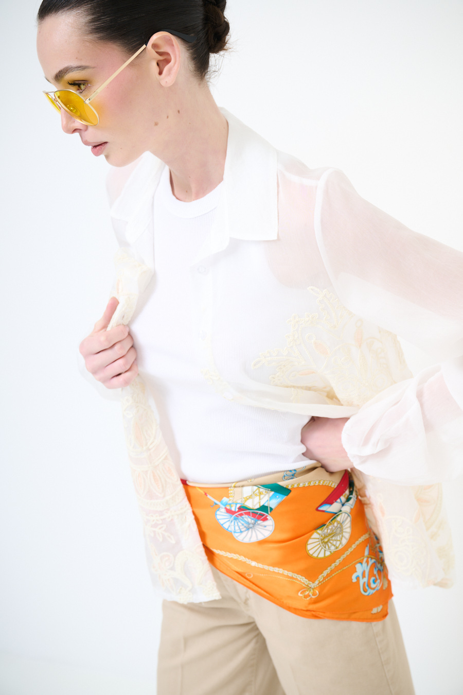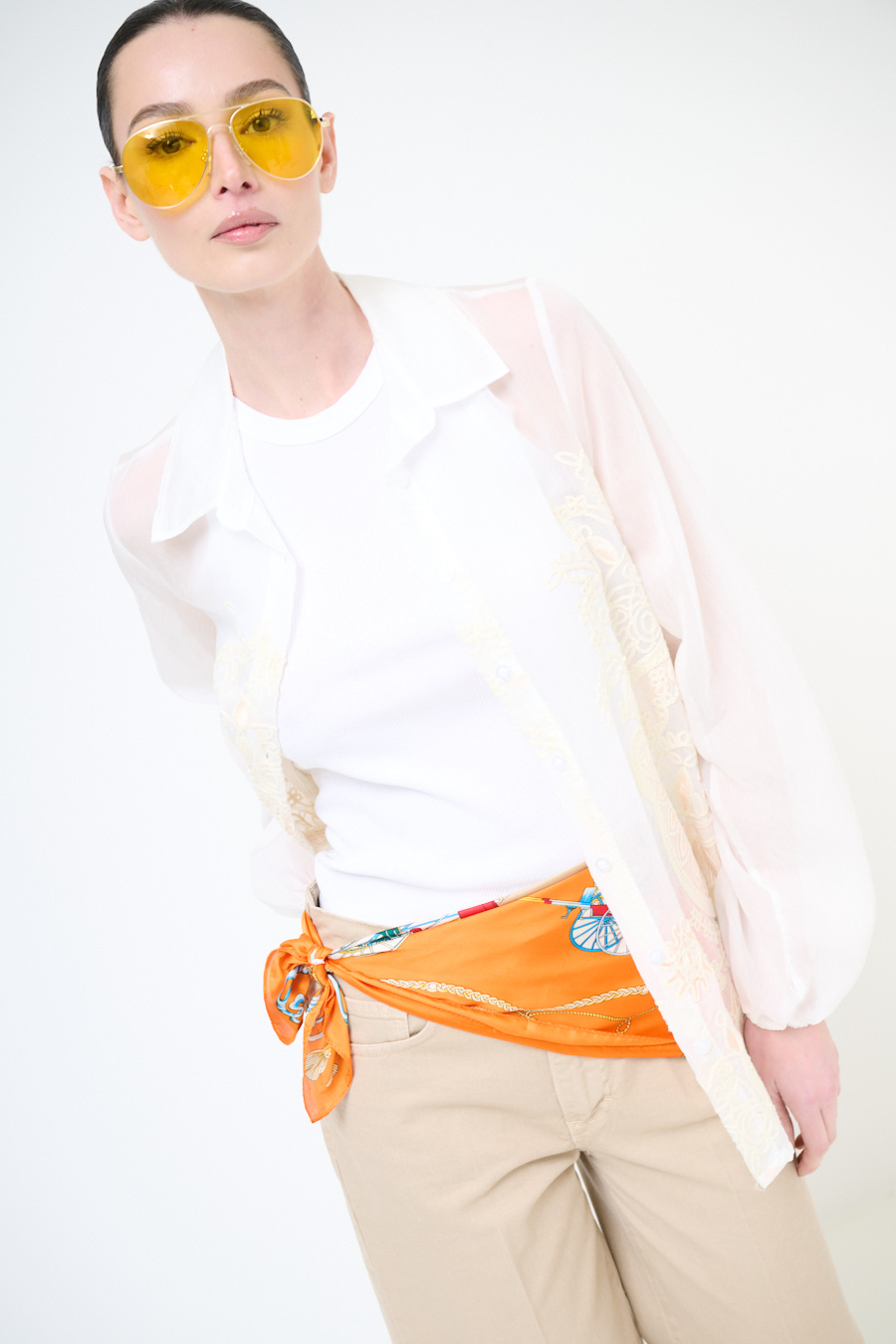 Oversized semi-sheer shirt with embroidery and elastic cuffs