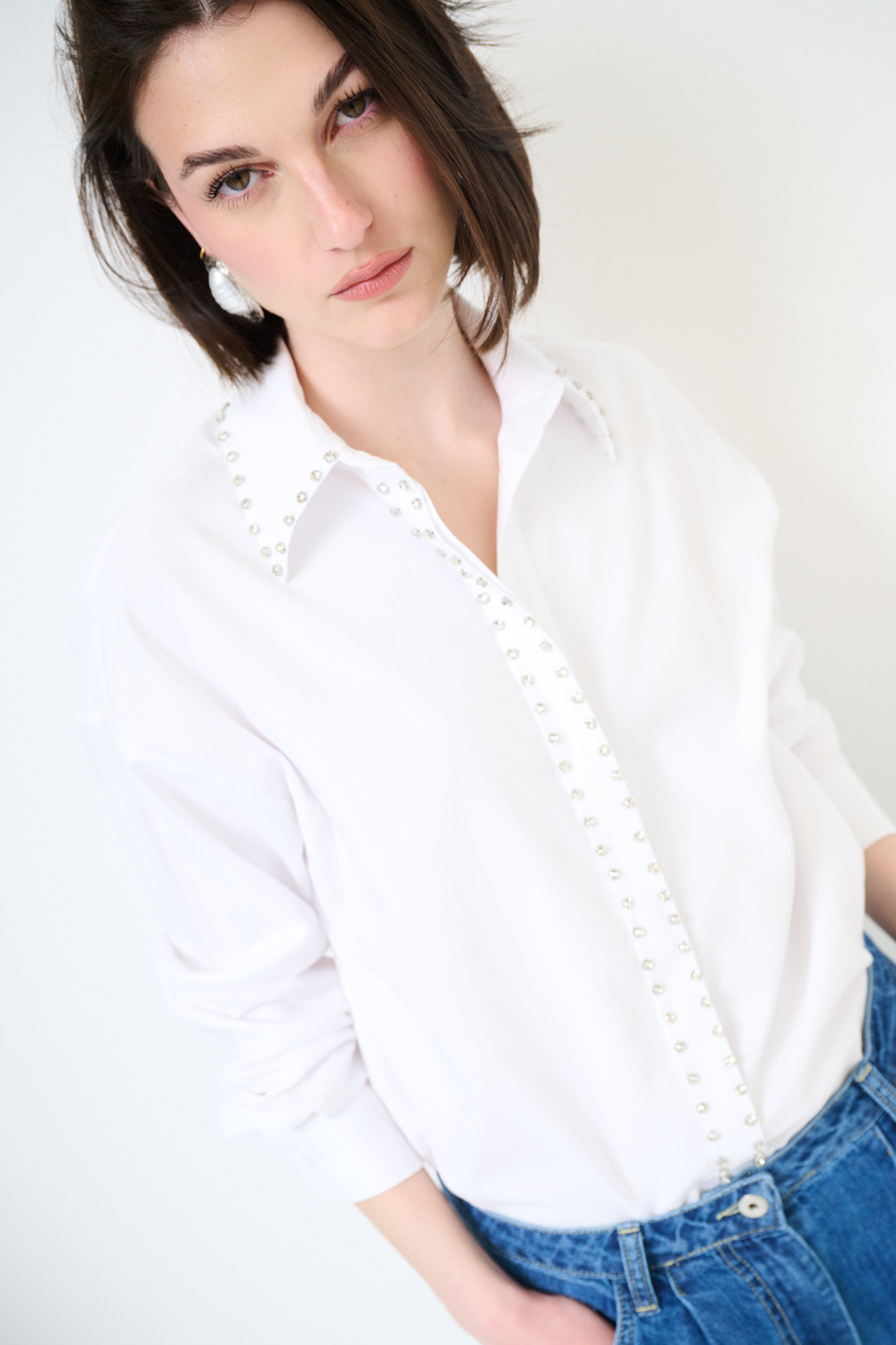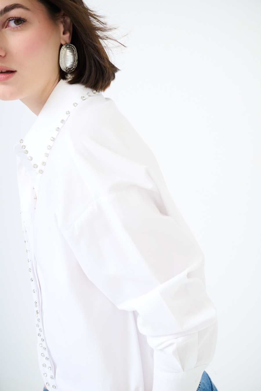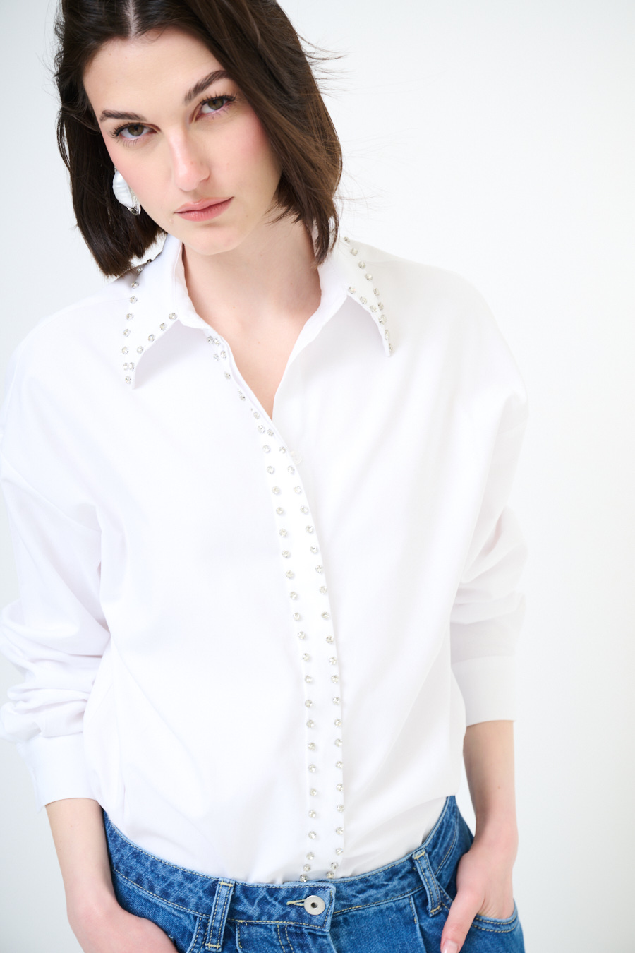 Oversized Oxford shirt with placket-covered buttoning and jewel stud application, rounded at the hem