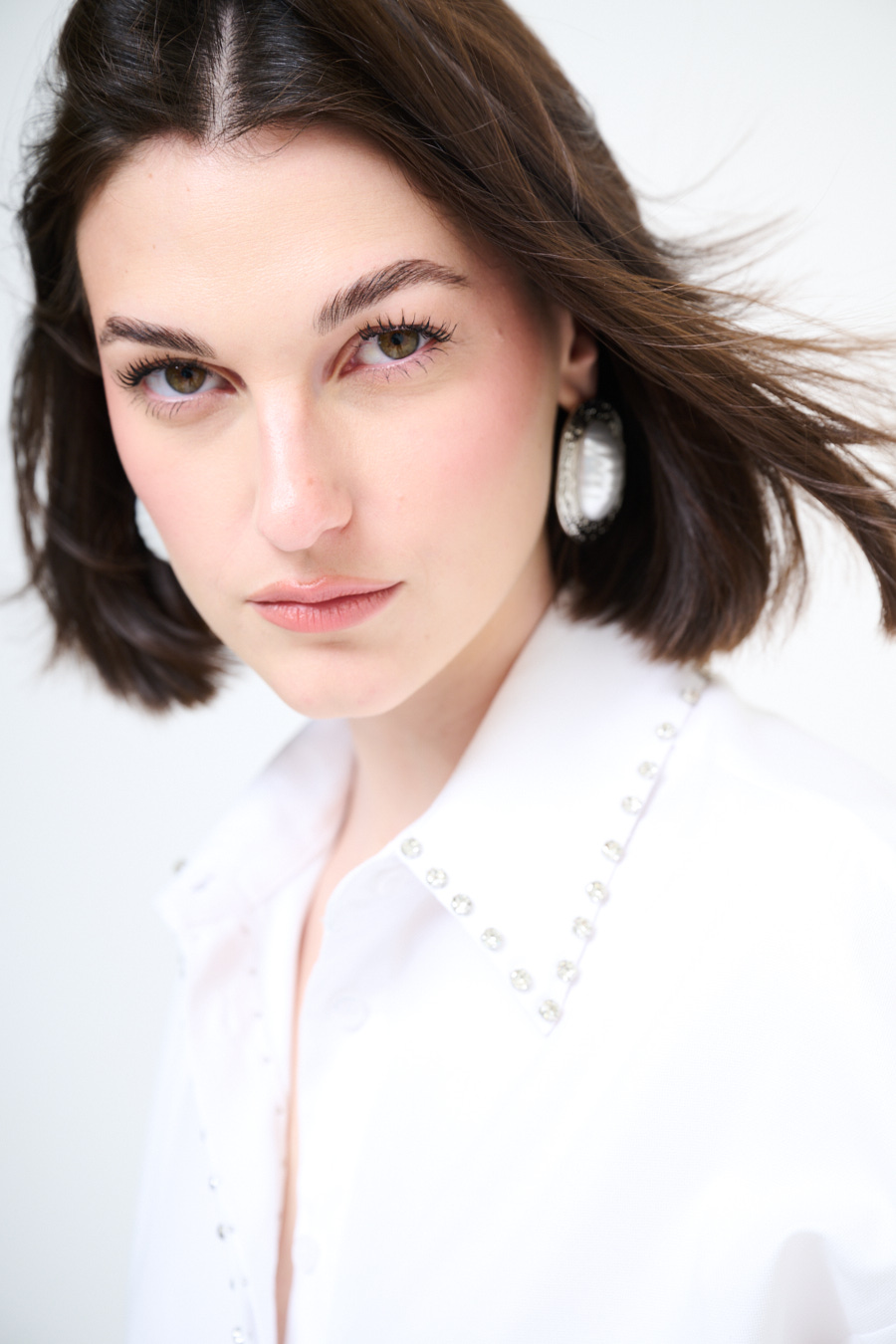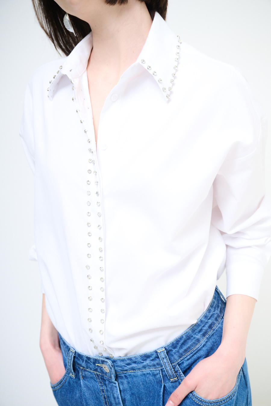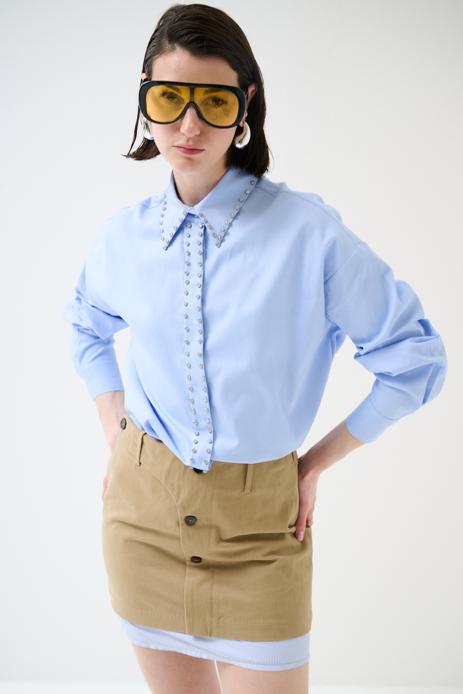 Oversized Oxford shirt with placket-covered buttoning and jewel stud application, rounded at the hem