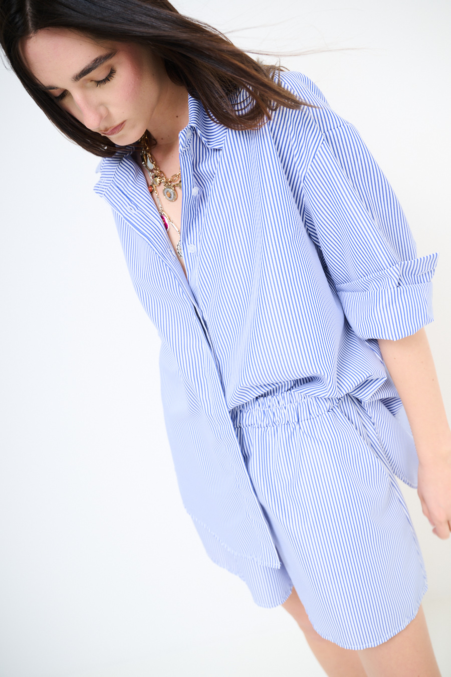 Oversized shirt with vertical stripes, rounded and longer on the back, central buttoning covered by a flap