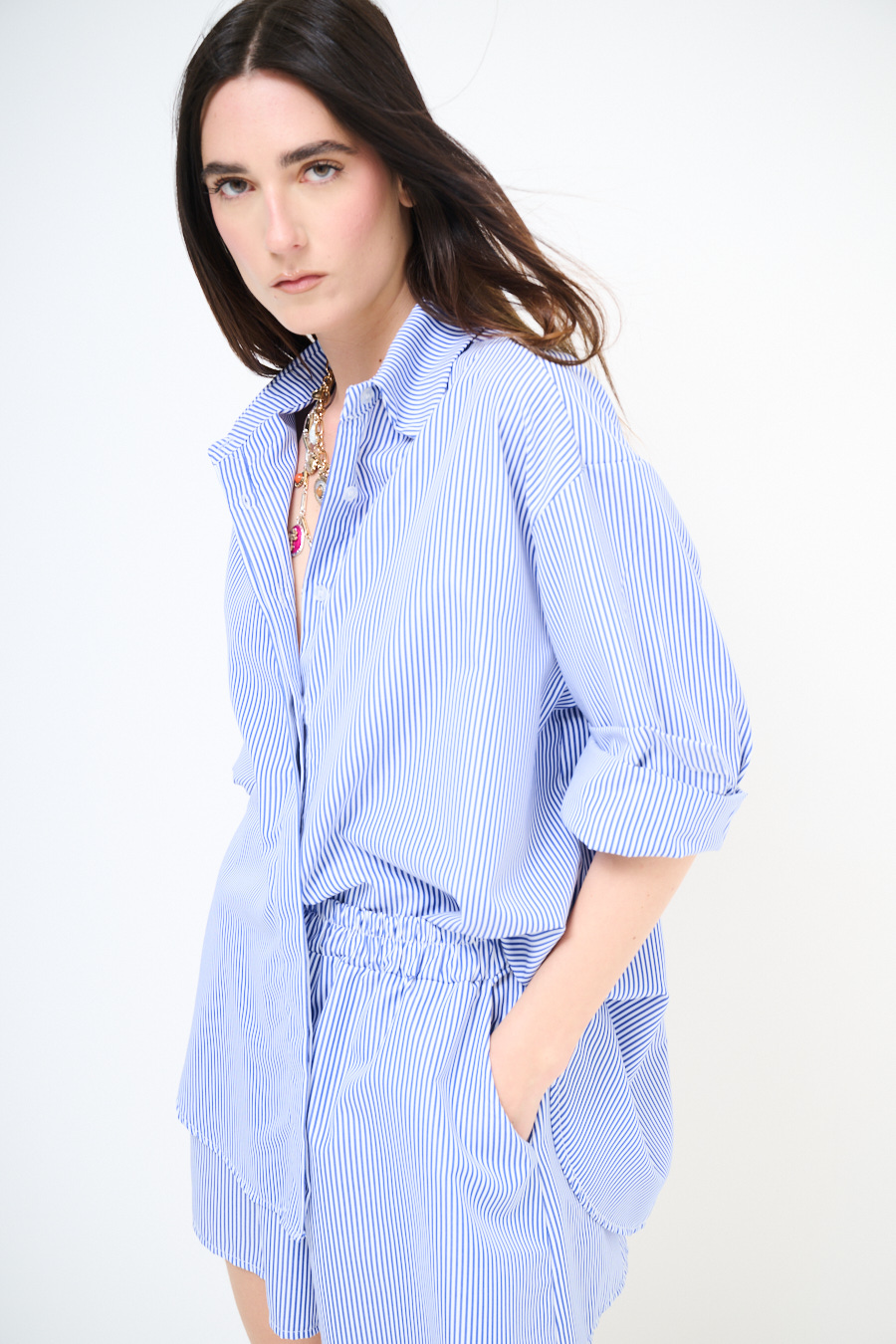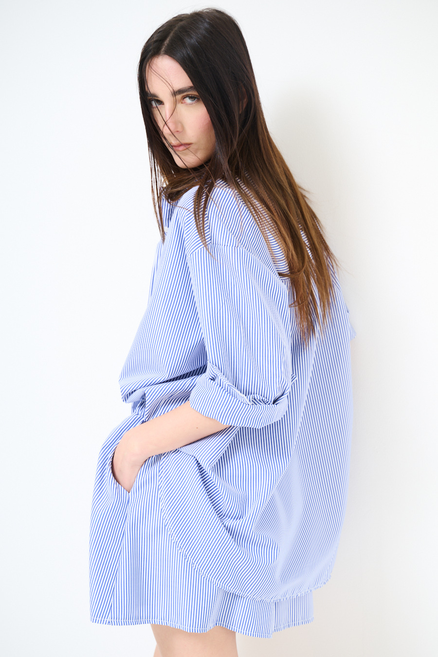Oversized shirt with vertical stripes, rounded and longer on the back, central buttoning covered by a flap