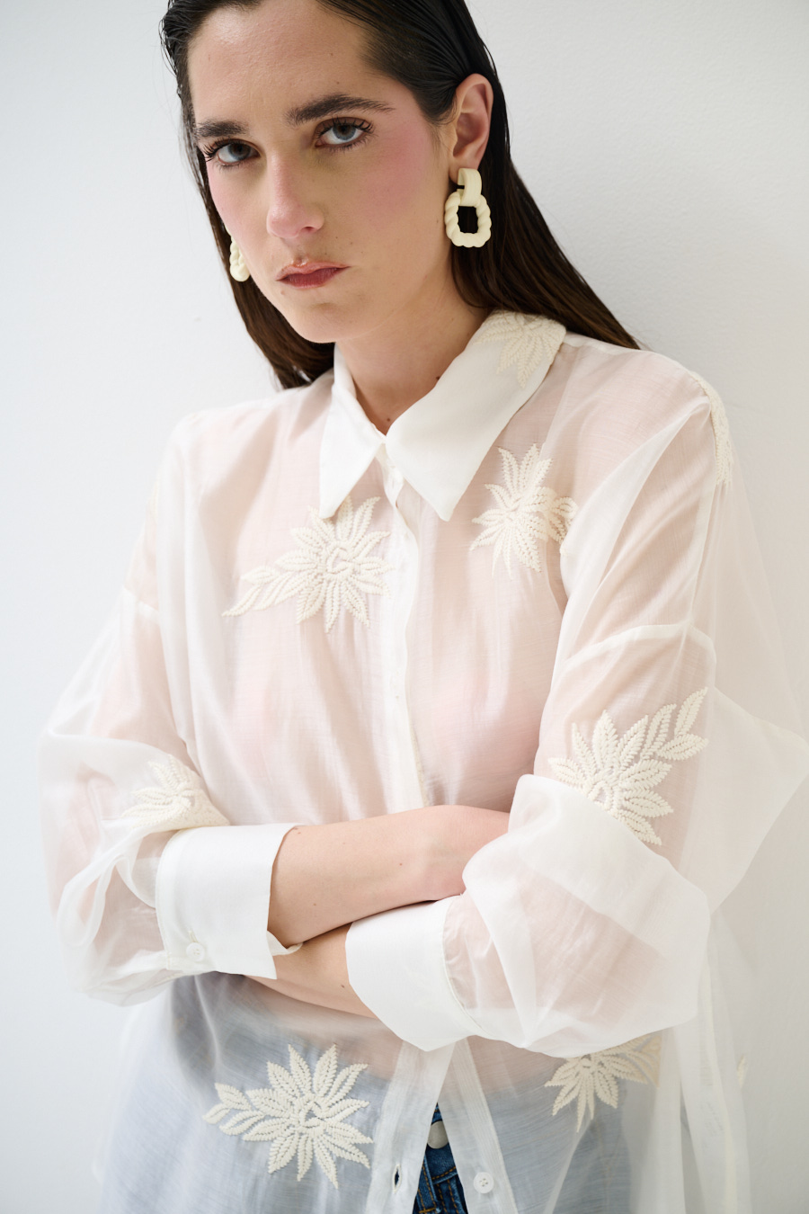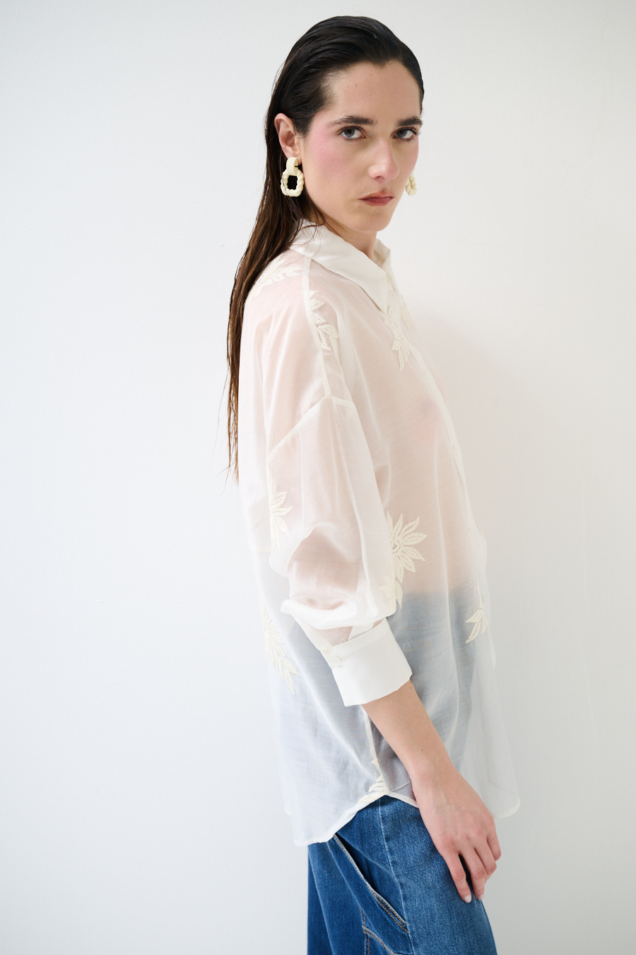 Oversized semi-sheer lyocell shirt with floral embroidery and central buttoning, rounded hem and dropped shoulder