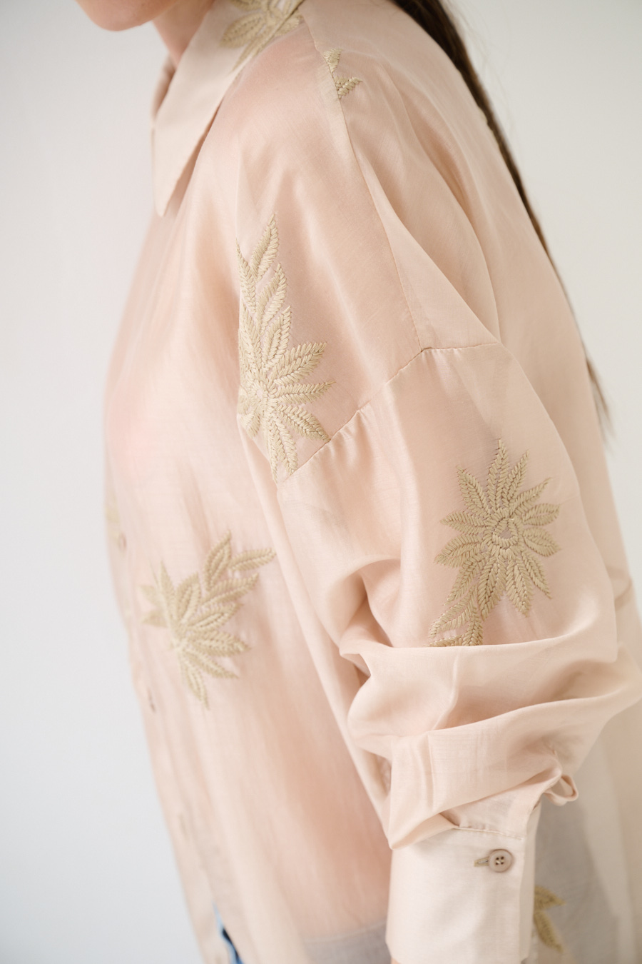 Camicia oversize in lyocell semi trasparente con ricamo floreale e abbottonatura centrale, stondata sul fondo e con spalla calata