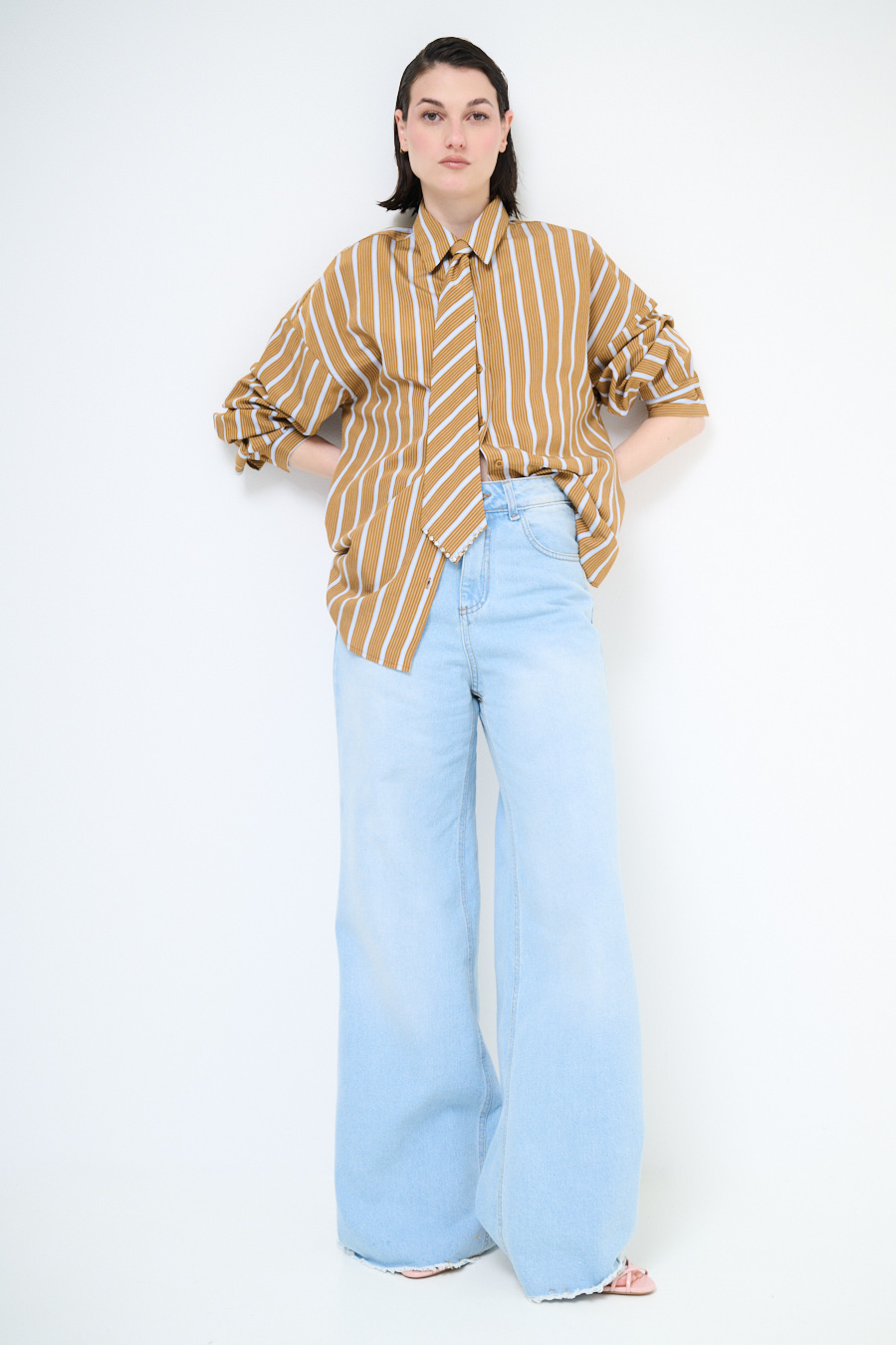 Oversized striped viscose shirt with tie and studs on the hem