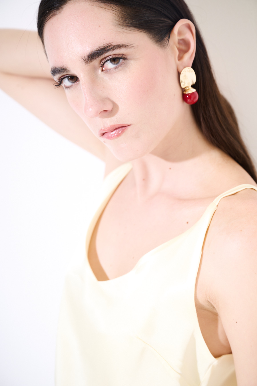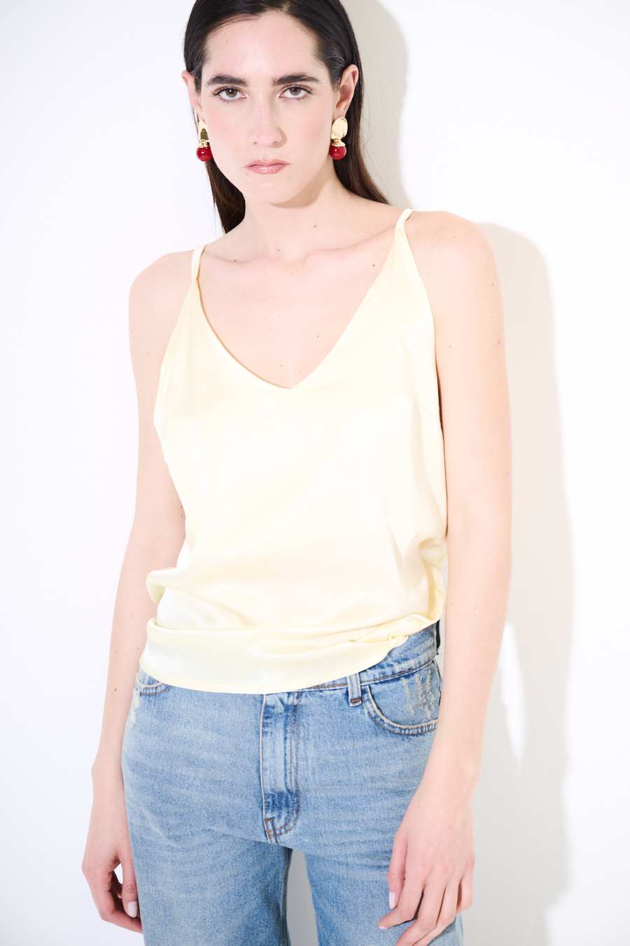 Basic viscose satin tank top with thin straps and wide V-neck front and back