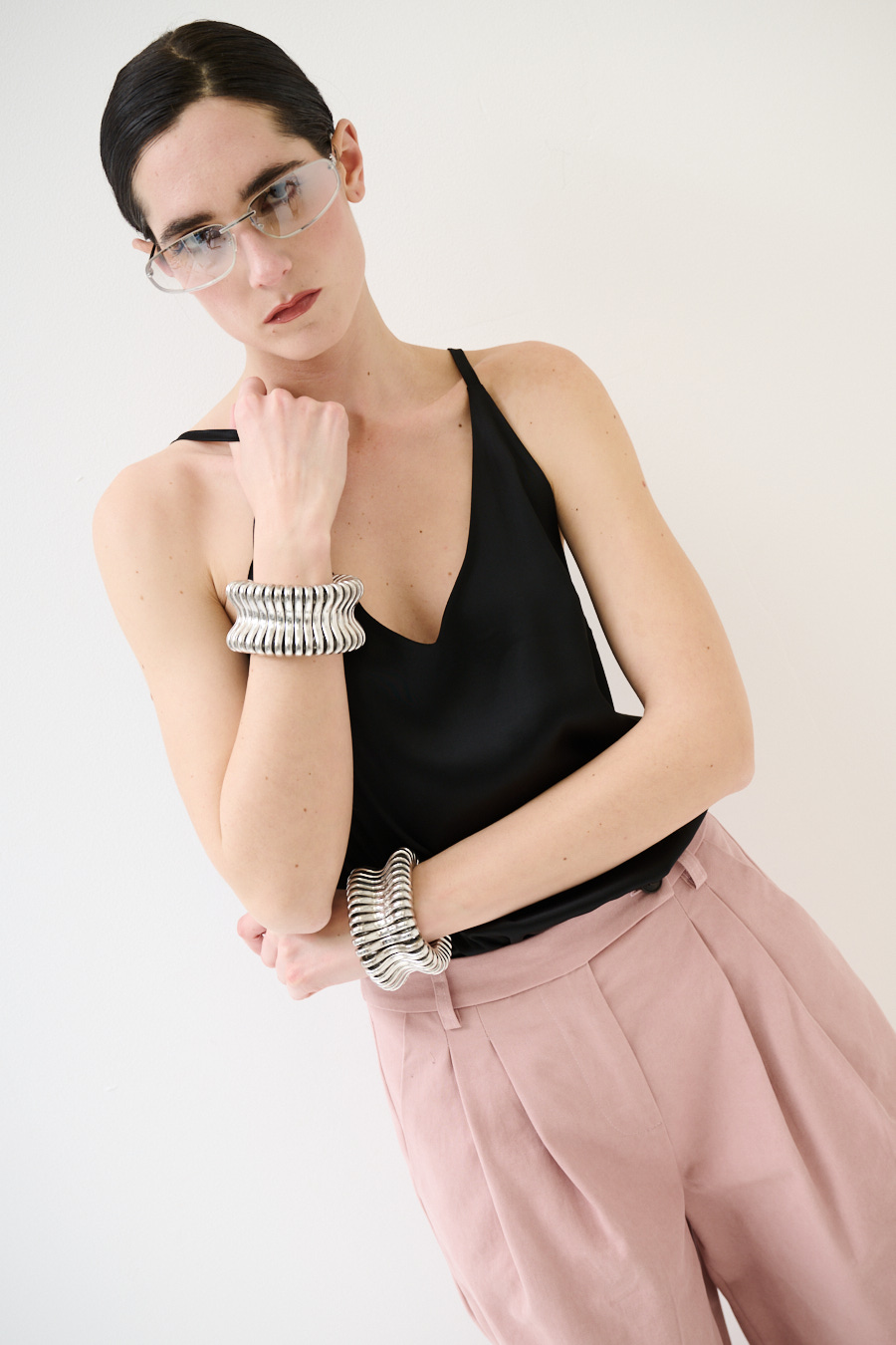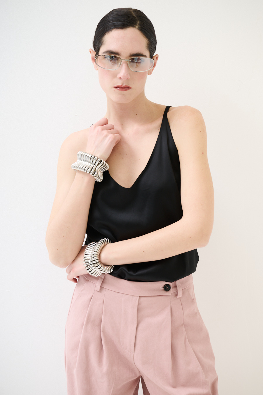 Basic viscose satin tank top with thin straps and wide V-neck front and back