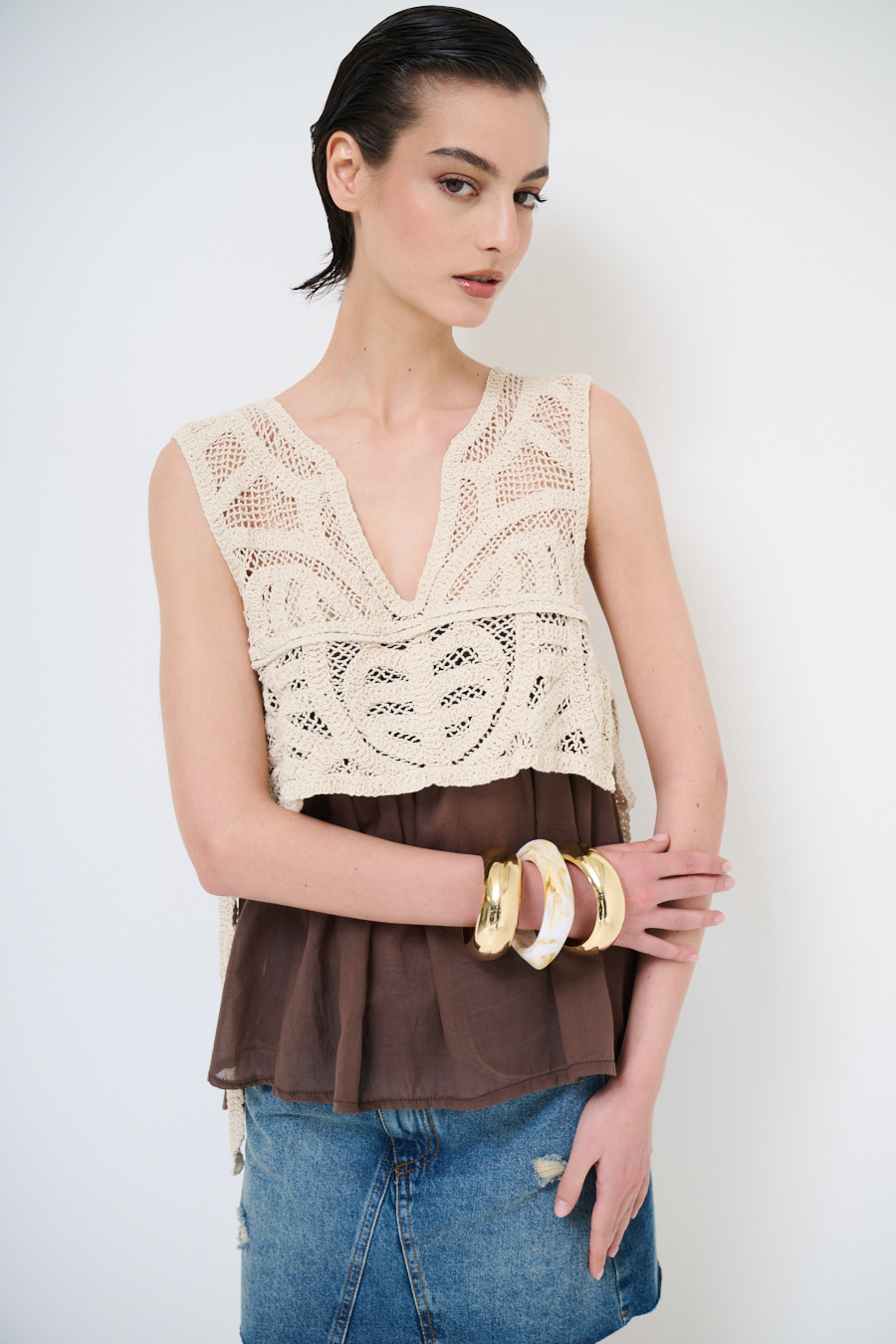 Canotta in mussola di cotone con sovrapposizione di top in macramè