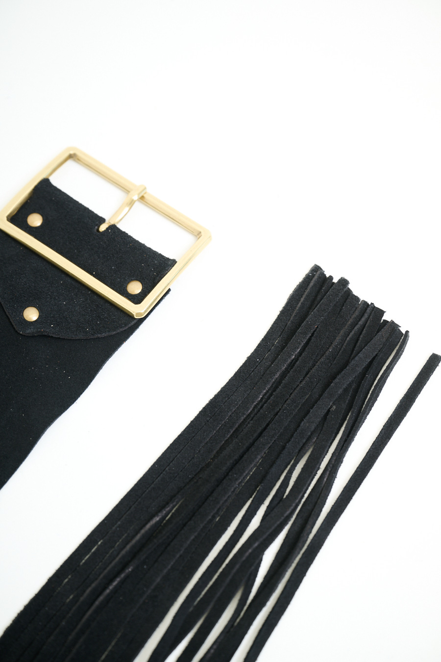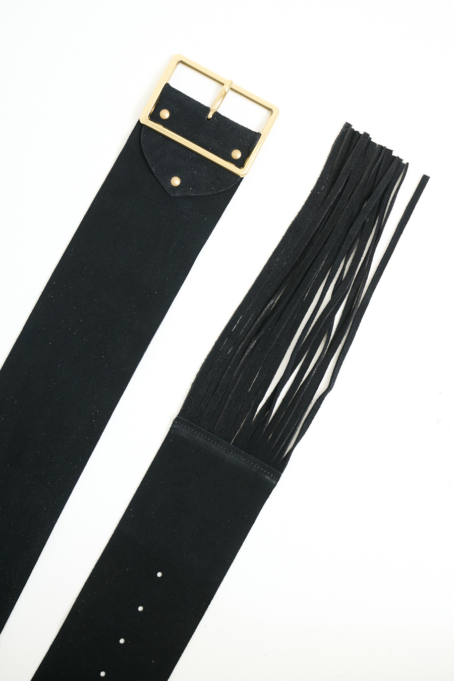 Genuine leather belt, soft suede model, with rectangular buckle and fringe at the bottom