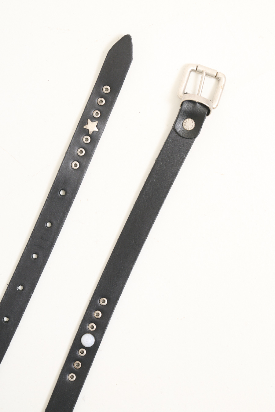 Thin leather belt with stones, emeralds and studs along the length, brushed-effect buckle