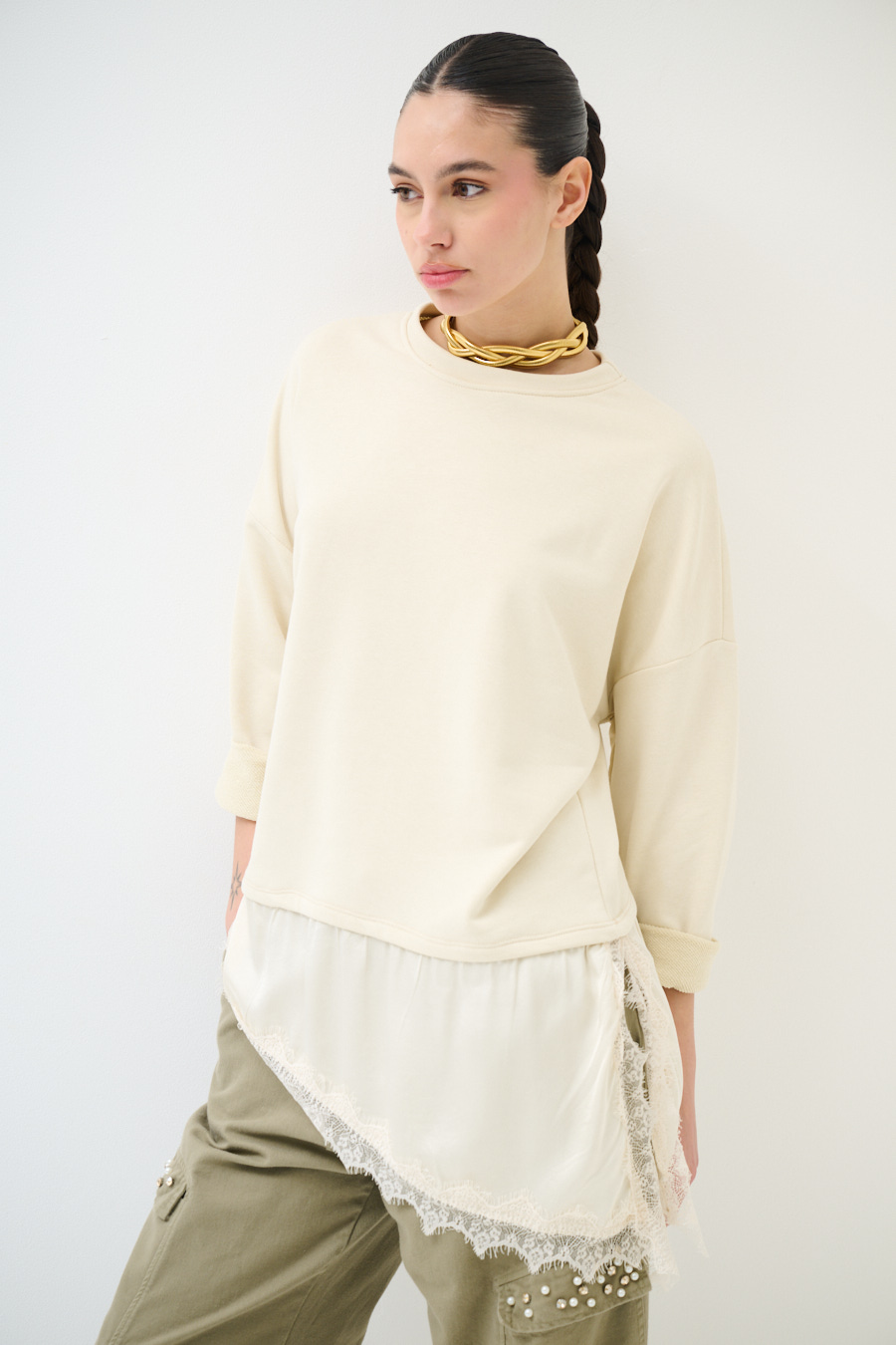 FELPA OVER CON RASO E PIZZO ASIMMETRICO BURRO