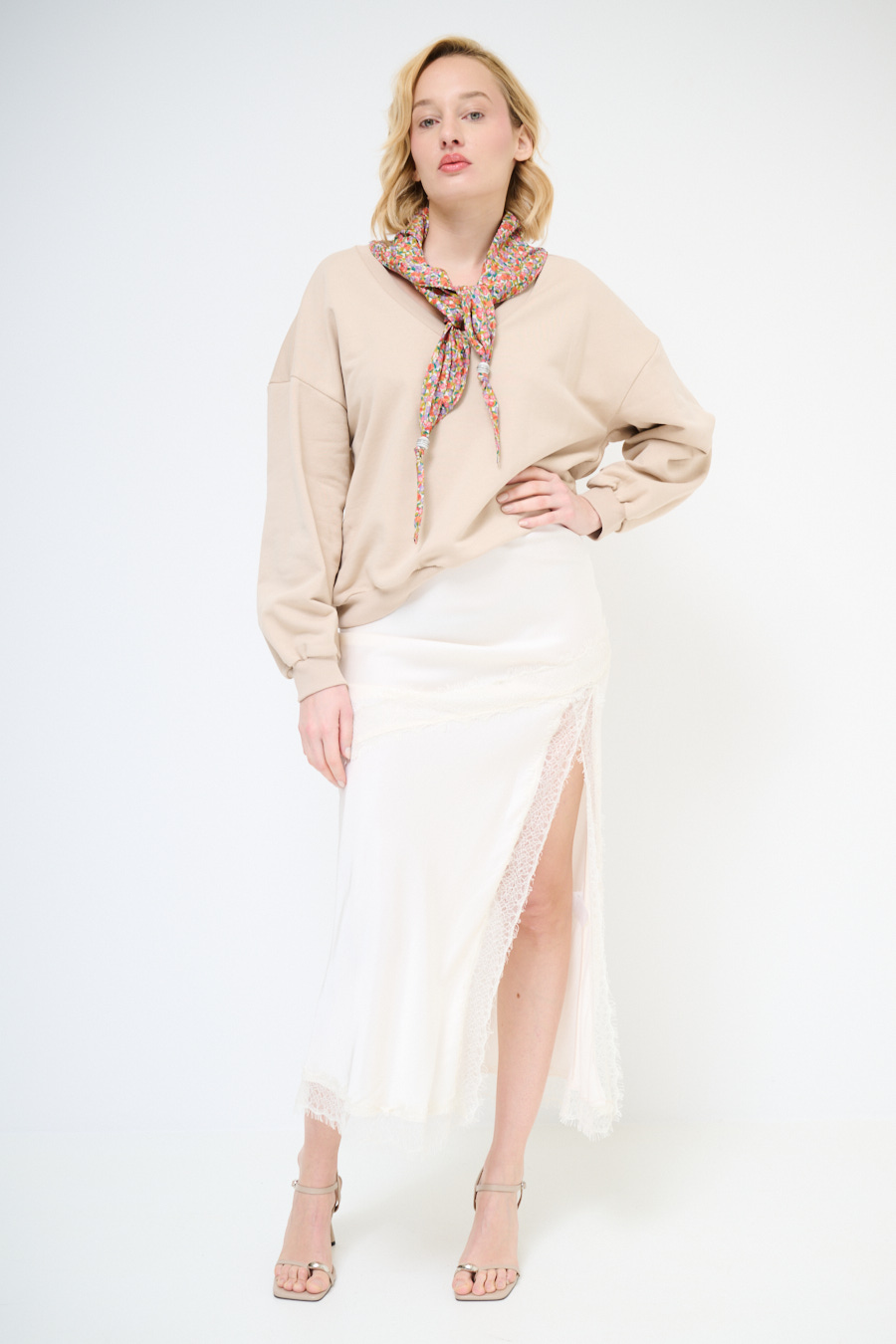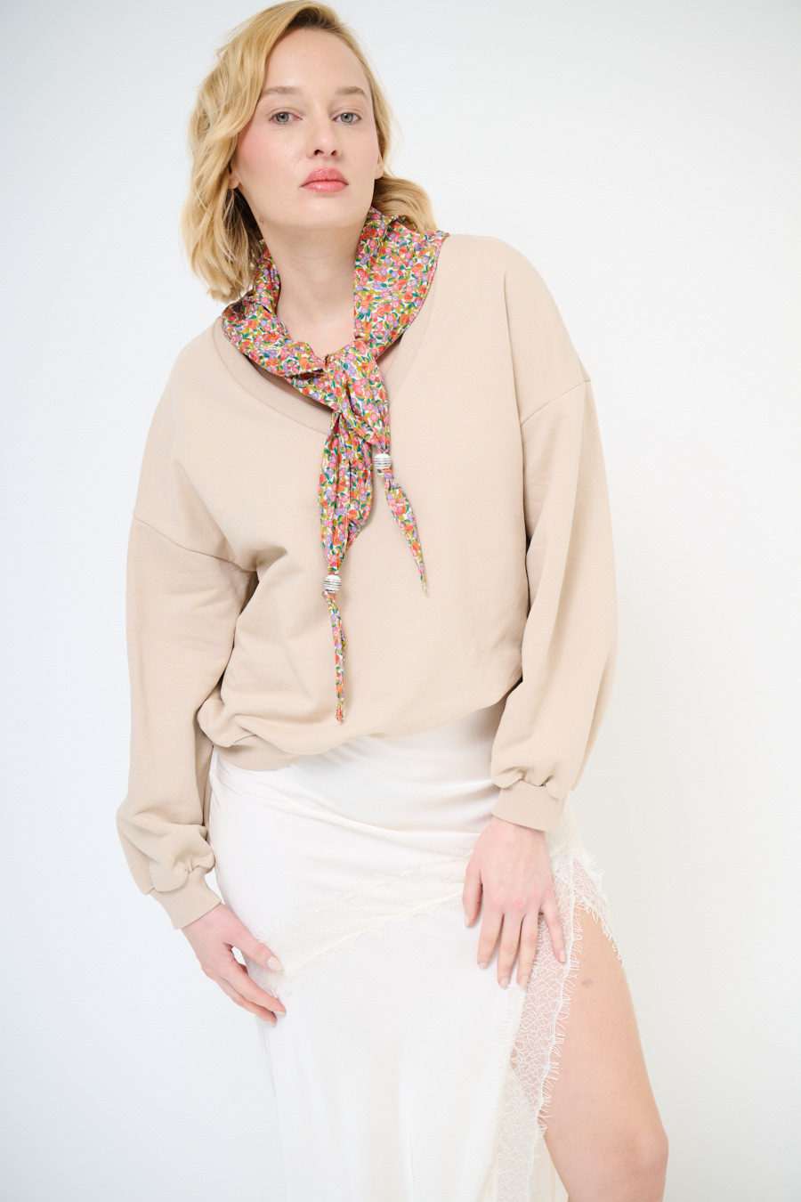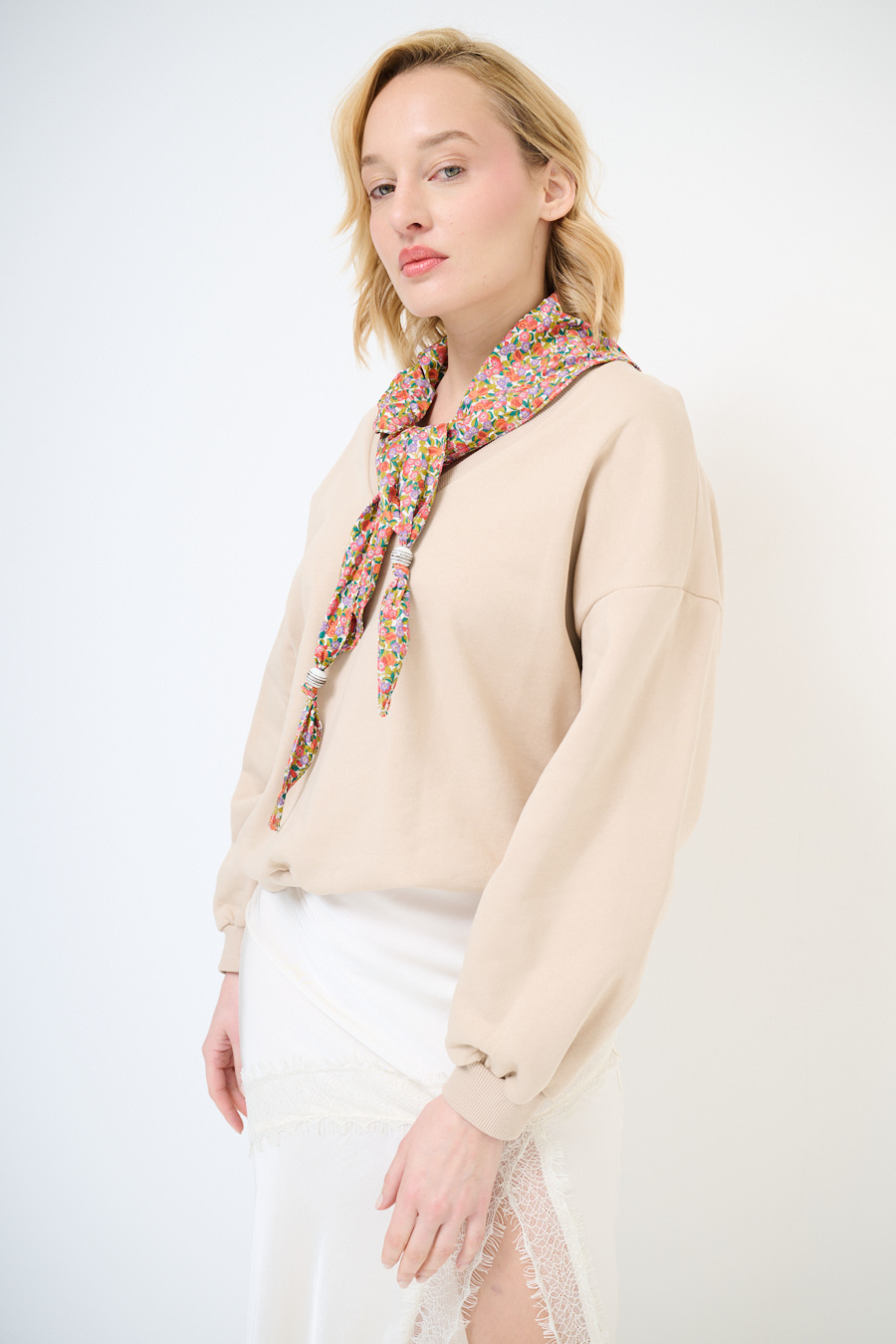 FELPA OVER SCOLLO V + FOULARD SABBIA