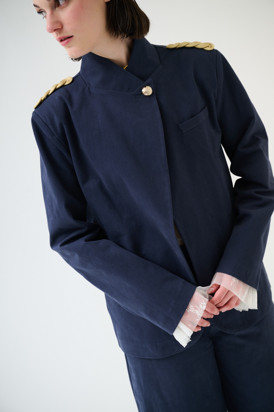 Napoleonic jacket with padded shoulders and shoulder accessory, fully lined and closure with a single high button at the neck