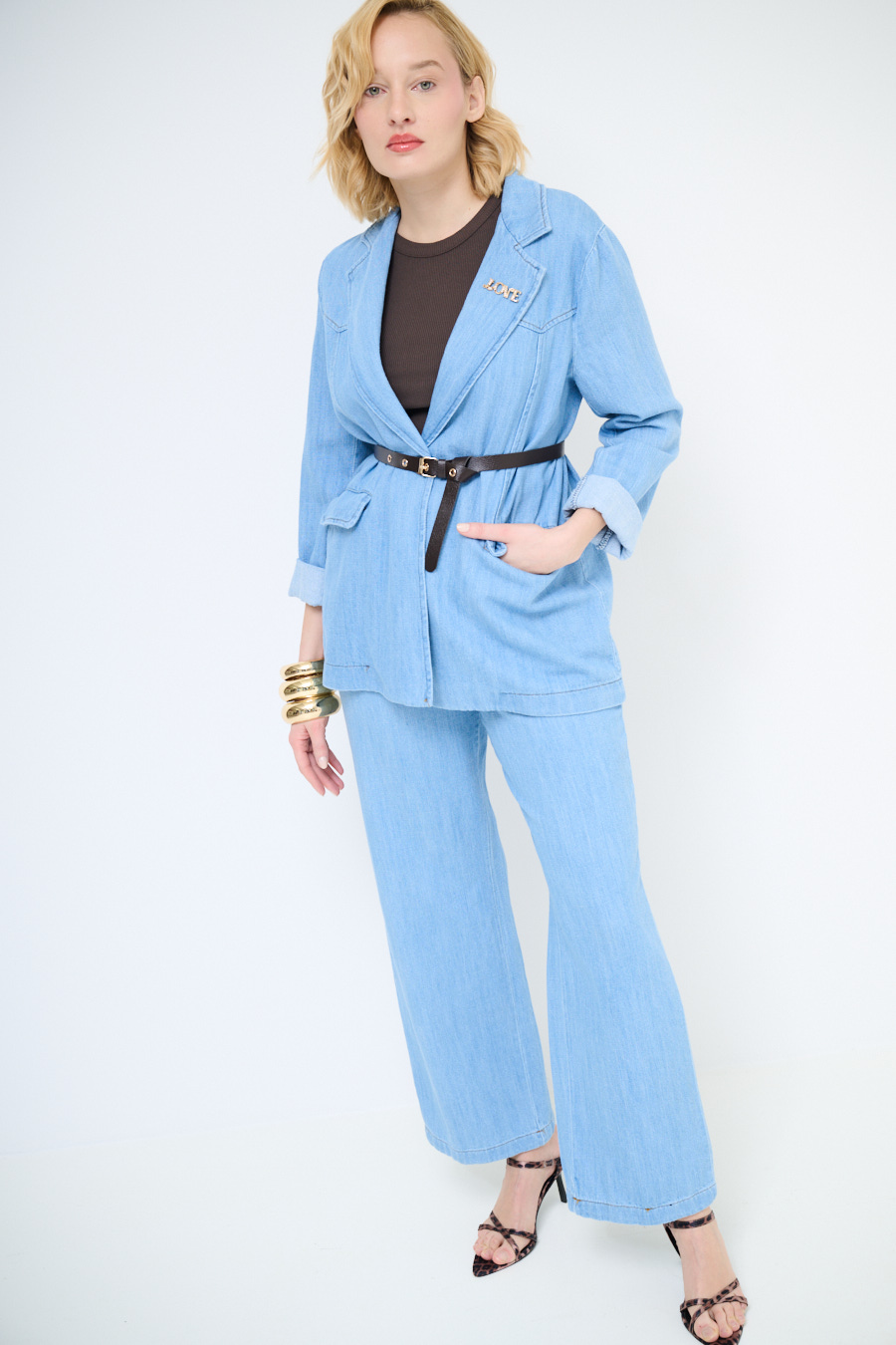 Giacca in denim scuro a un bottone con taschini e cintura in vita con passanti, sfoderata internamente e con spilla applicata sul collo rever