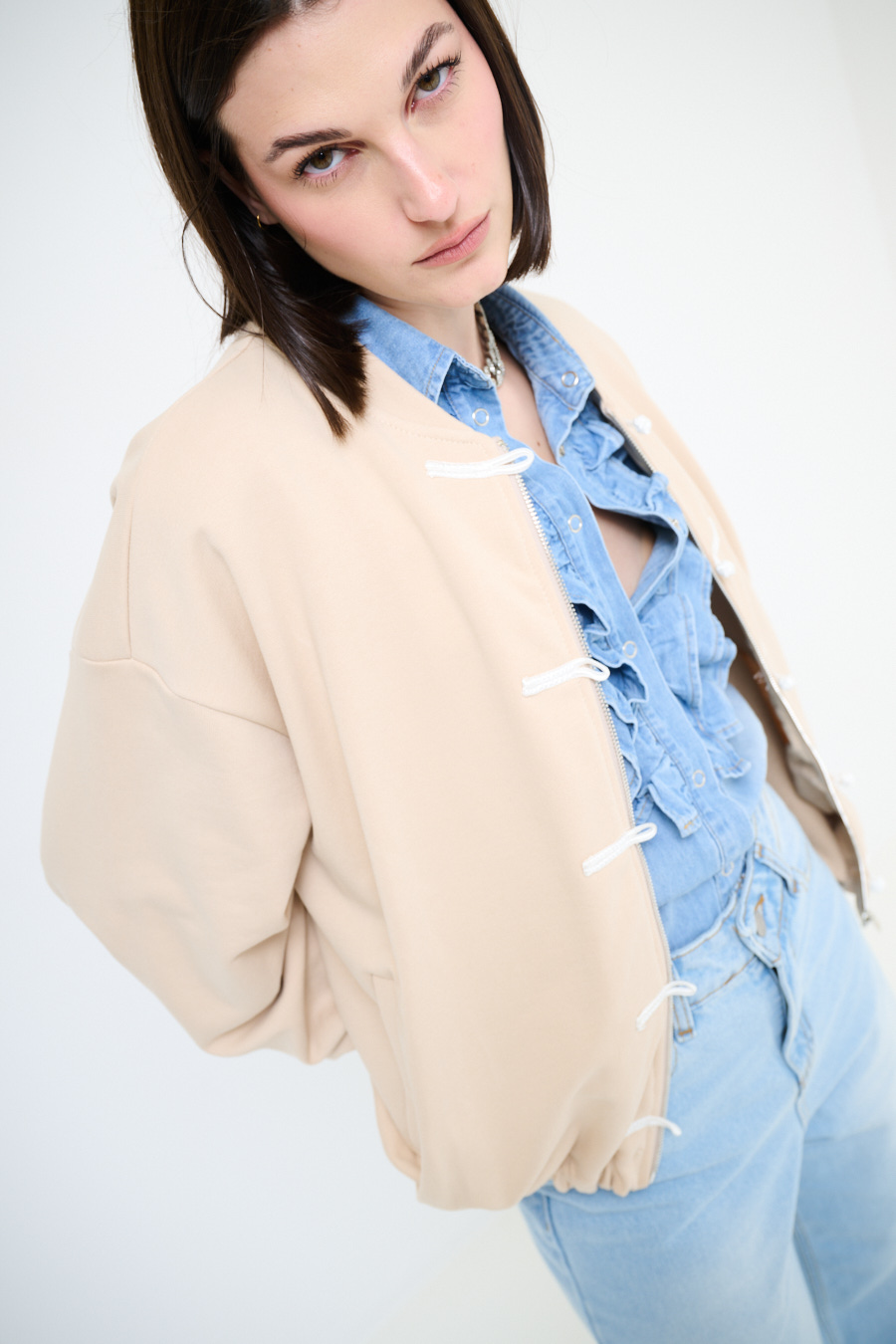 Brushed sweatshirt jacket with mandarin collar, dropped shoulder. Central zip closure and braiding, elasticated at the hem and cuffs