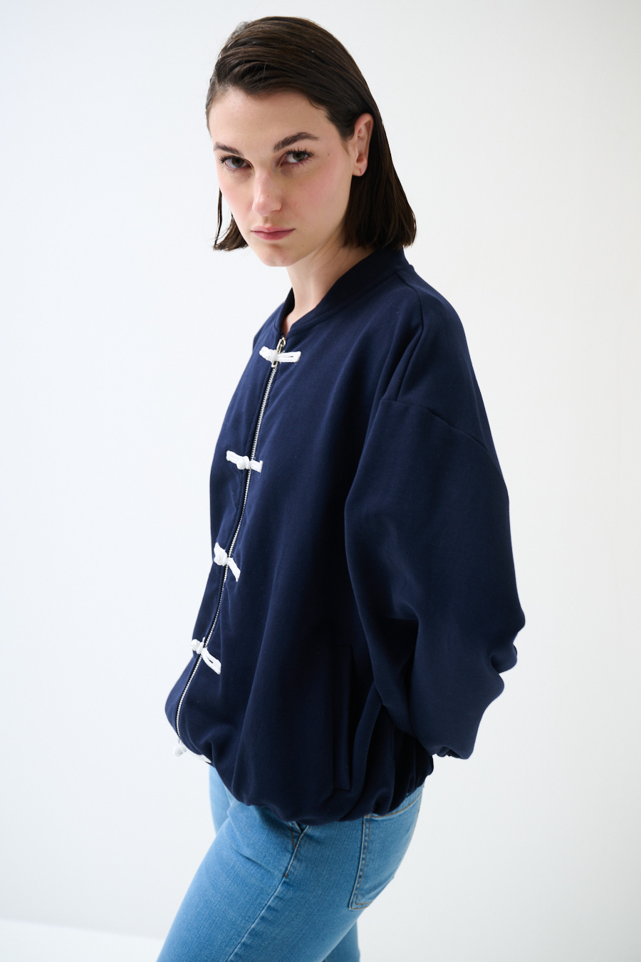 Brushed sweatshirt jacket with mandarin collar, dropped shoulder. Central zip closure and braiding, elasticated at the hem and cuffs