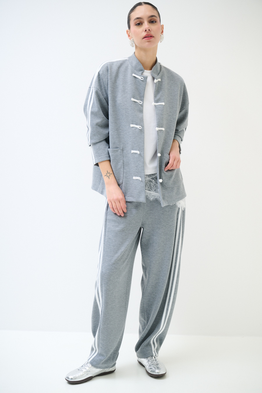 Kimono jacket with front closure with frog fastenings and contrasting side bands on the sleeves, with front patch pockets
