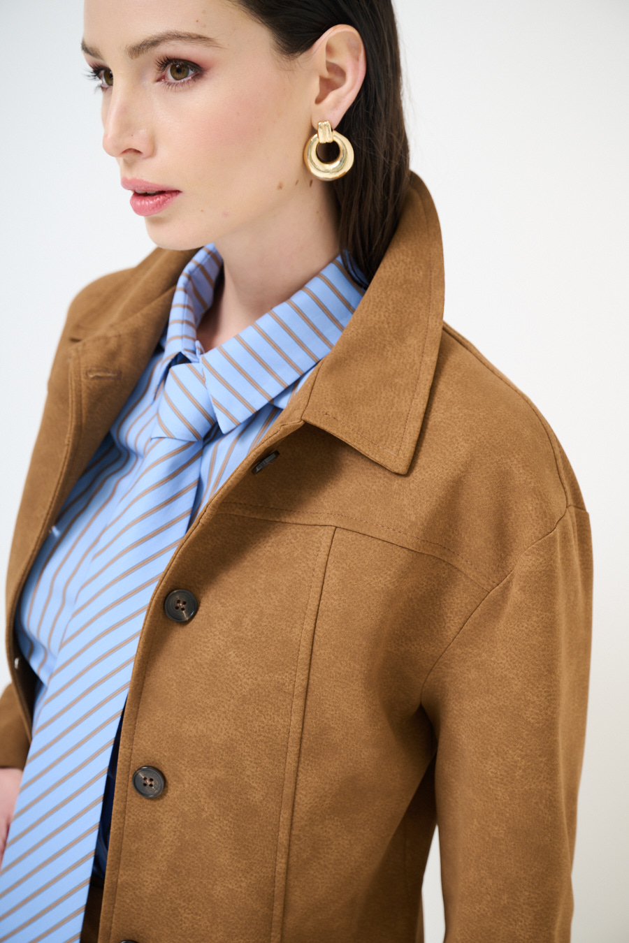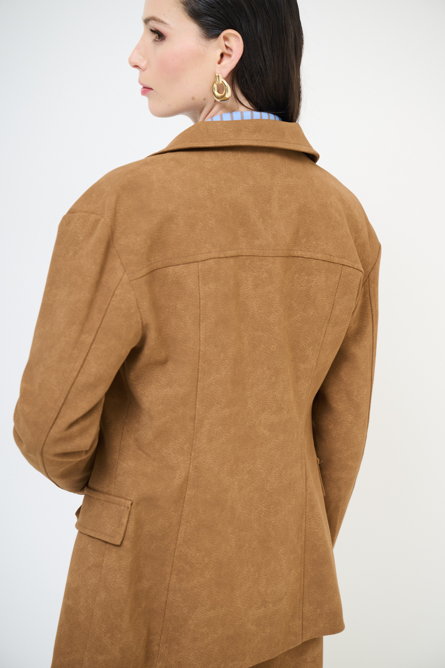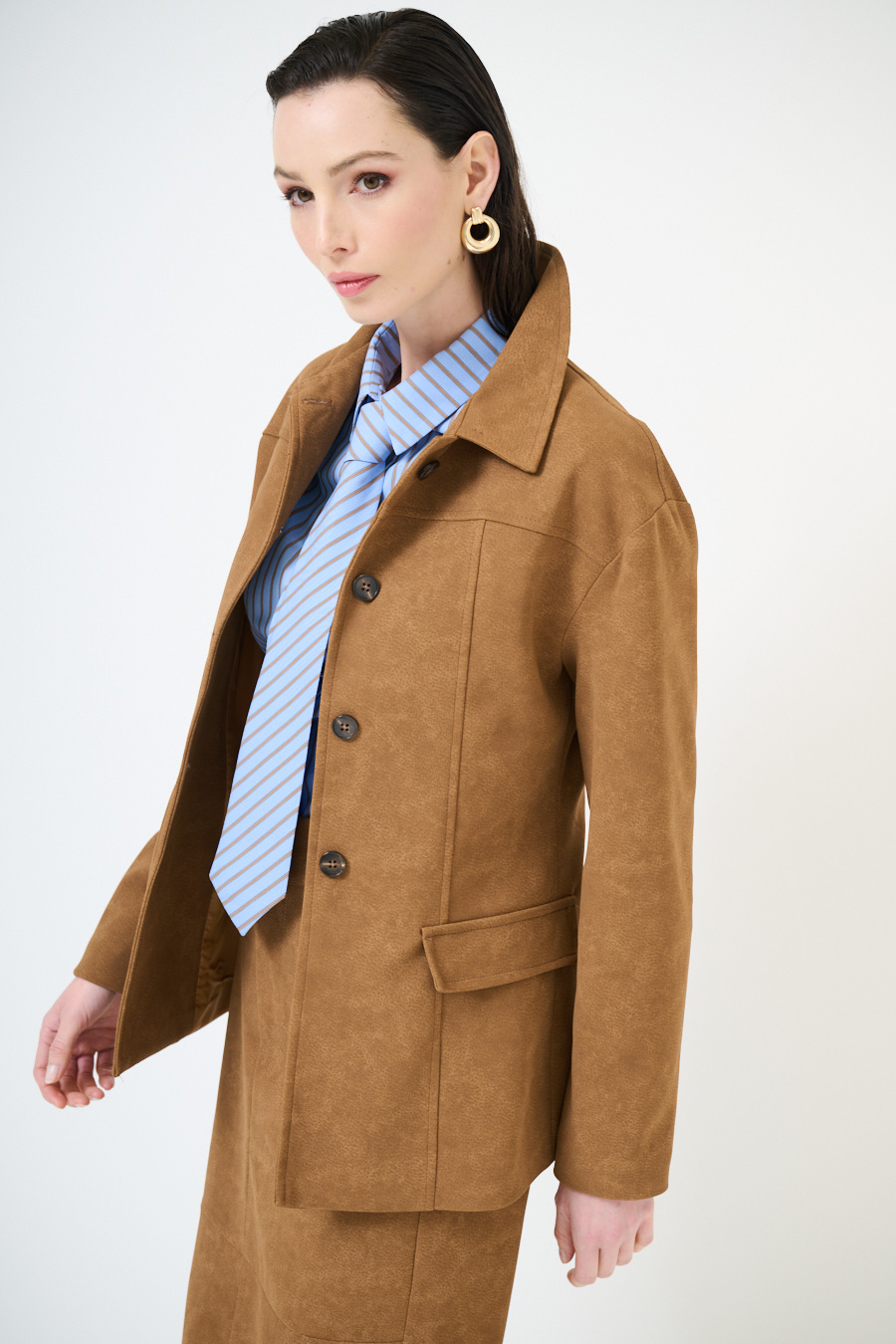 Fitted single-breasted jacket in suede with crust effect. Central buttoning down to mid-length, shirt collar and lined interior