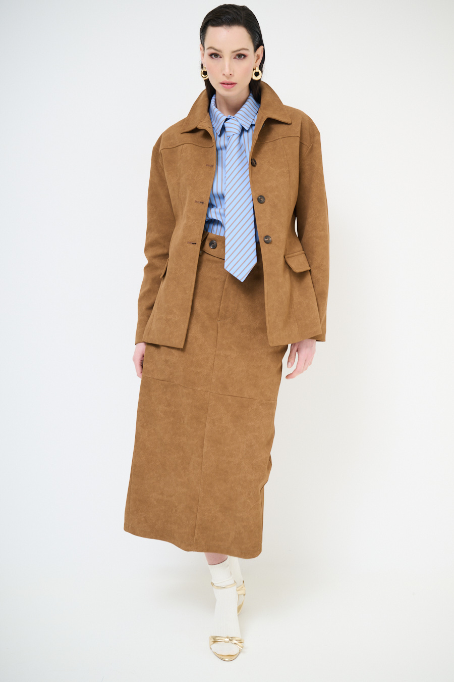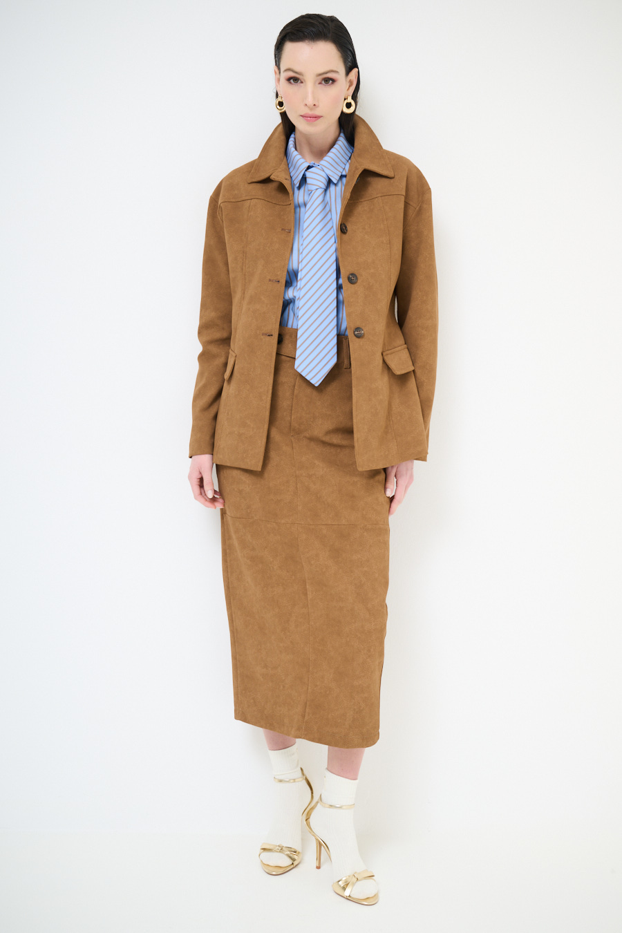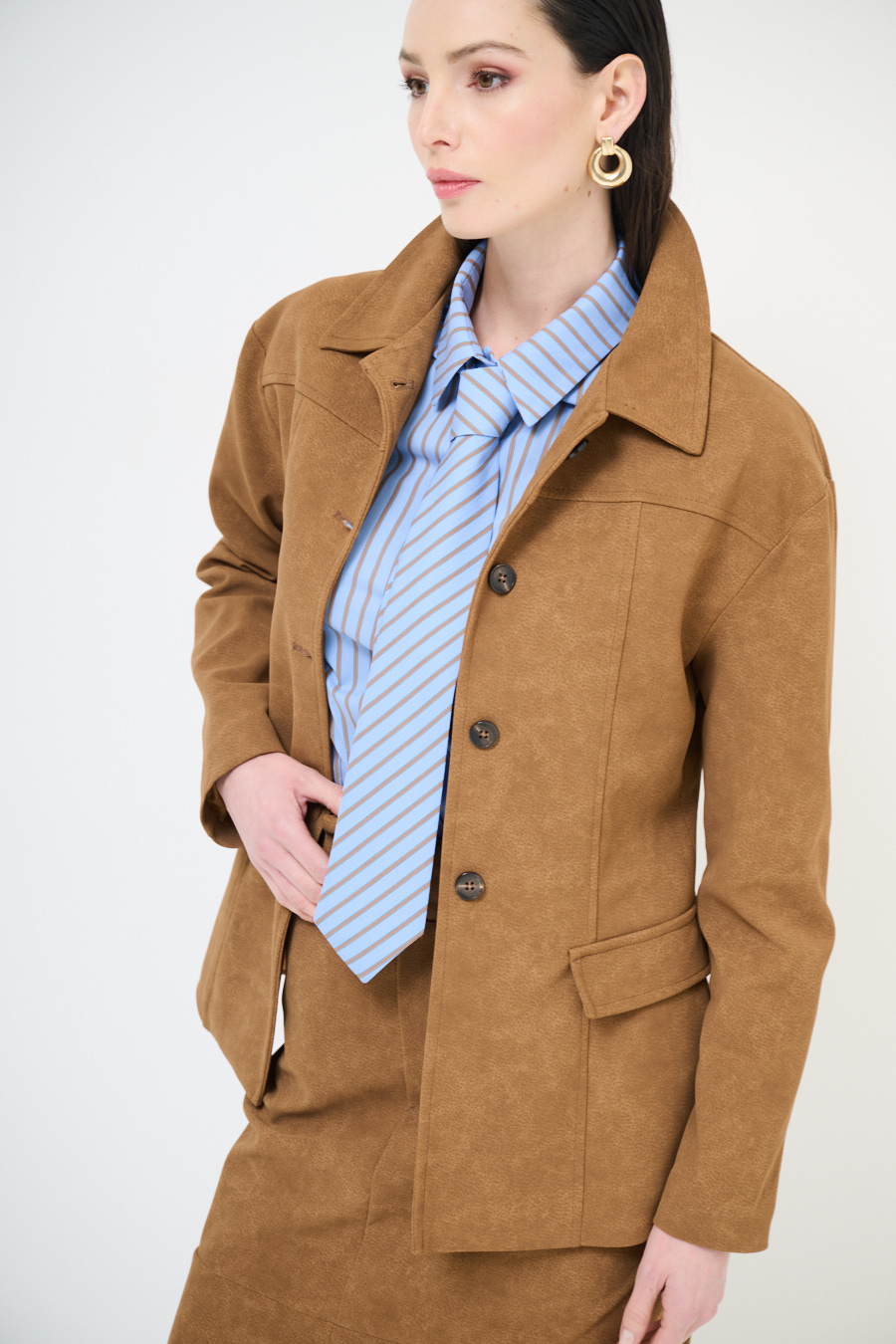 Fitted single-breasted jacket in suede with crust effect. Central buttoning down to mid-length, shirt collar and lined interior
