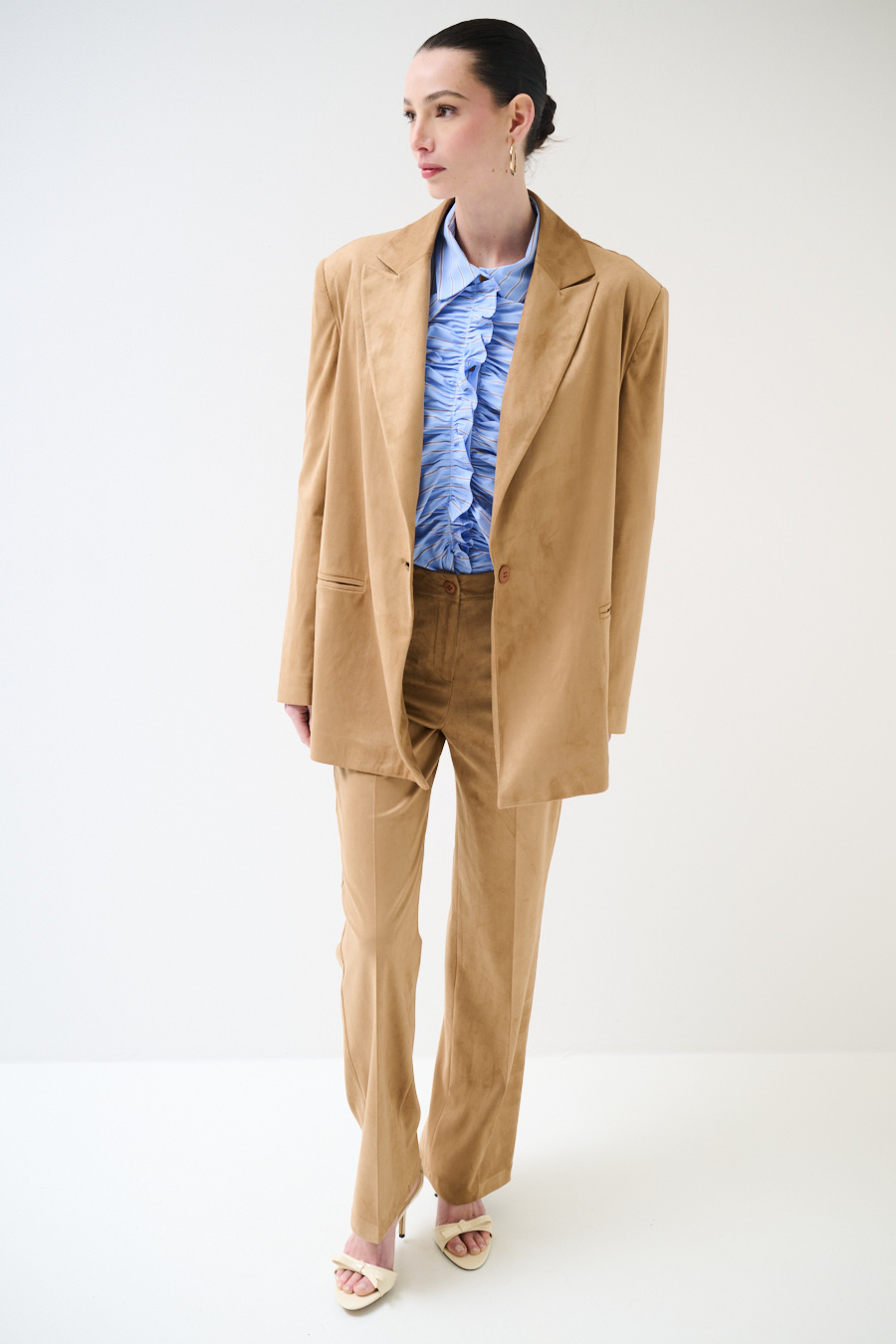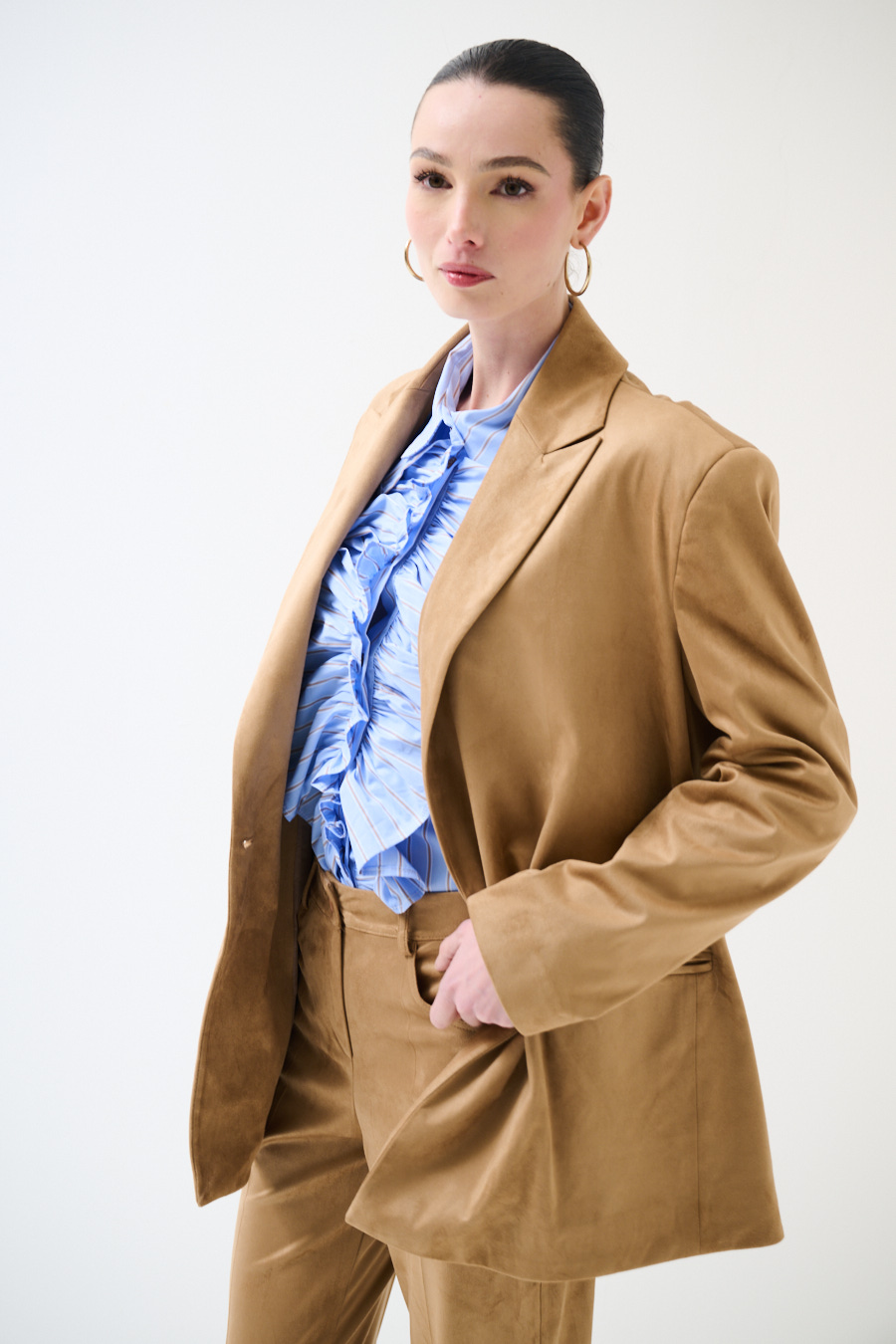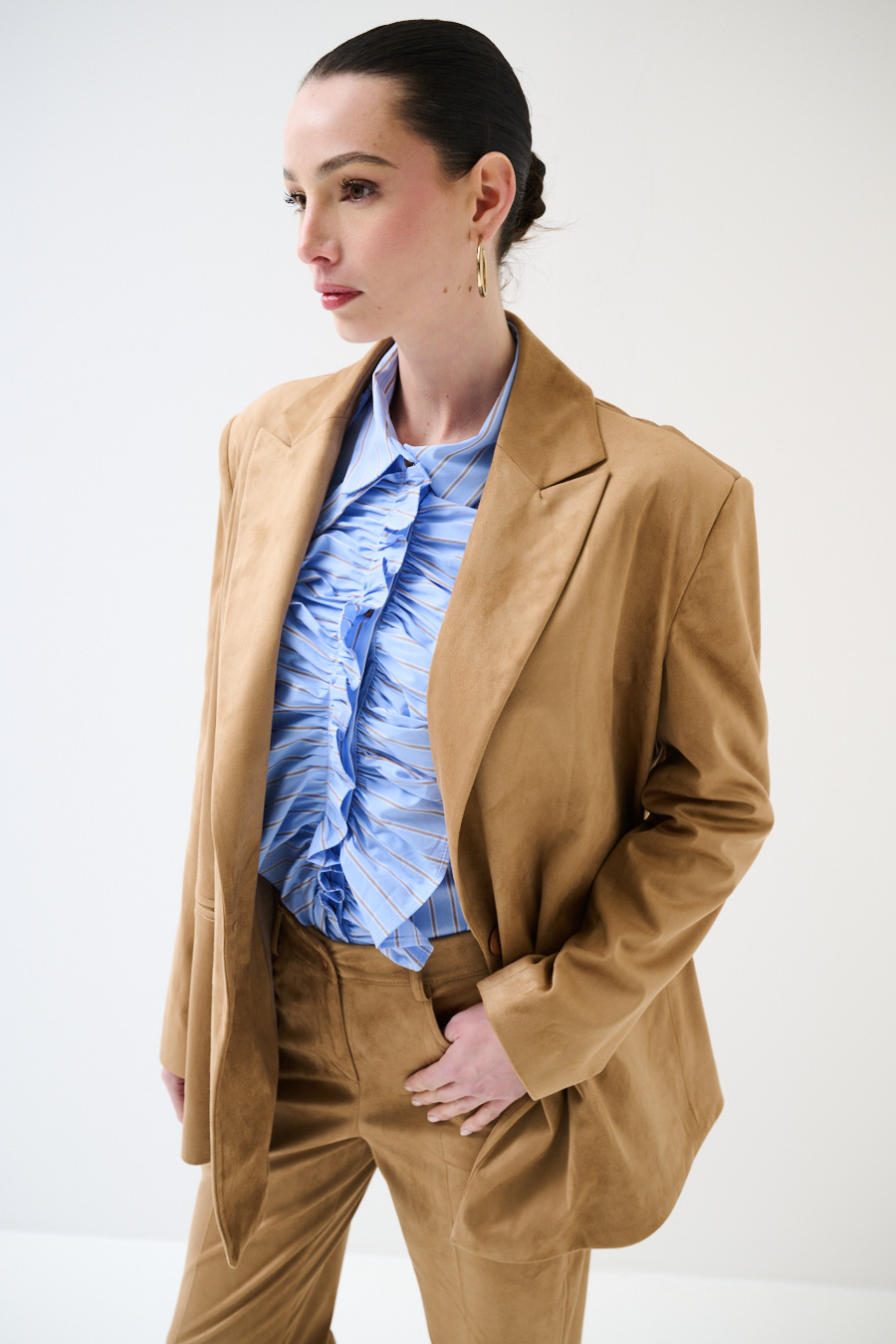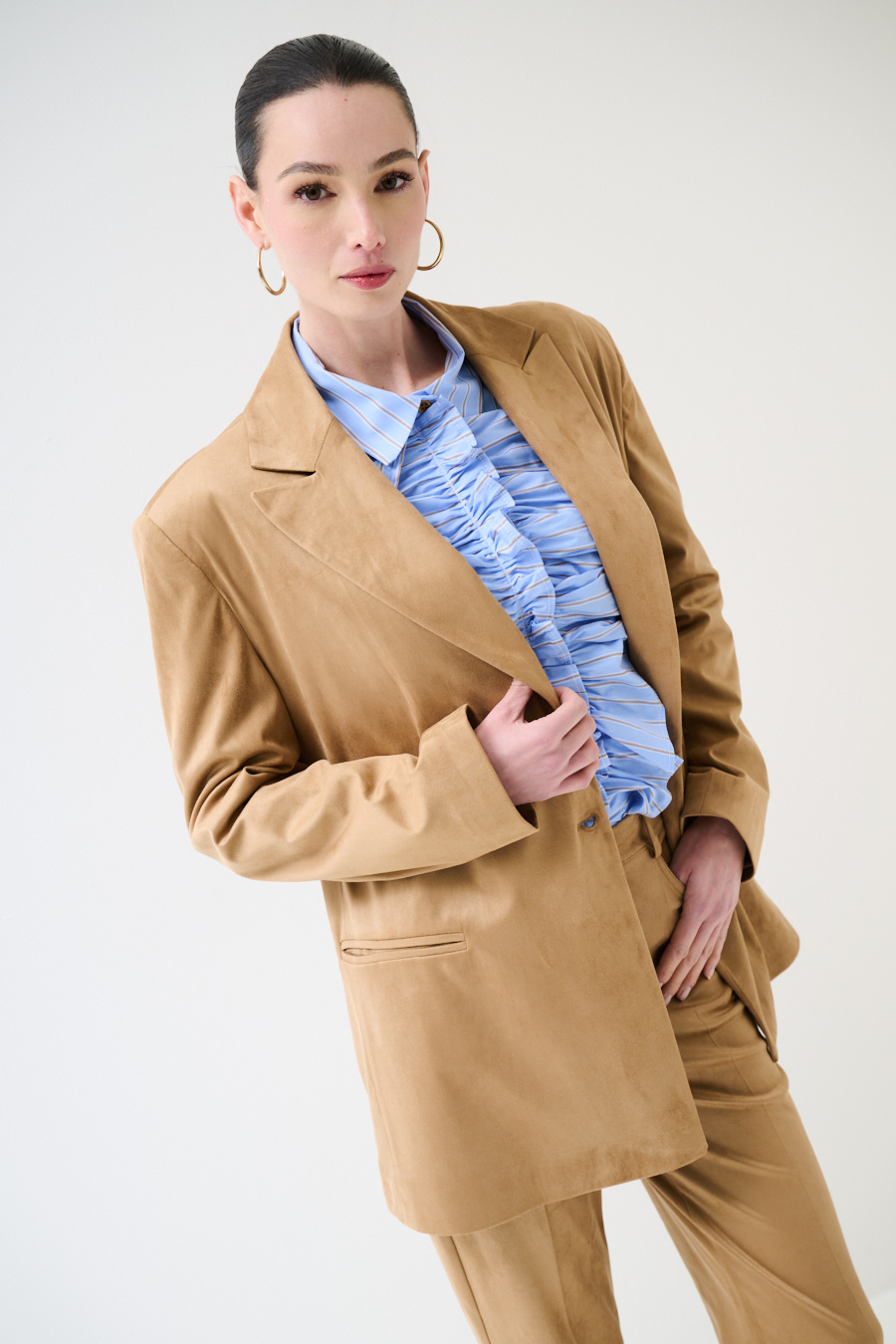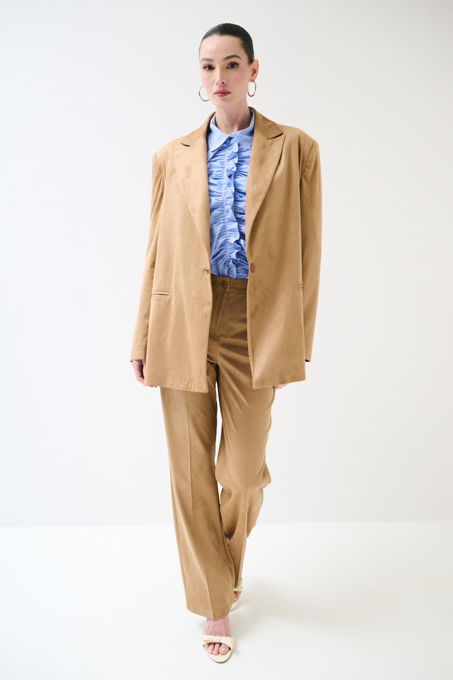 Oversized one-button twill jacket with welt front pockets, padded shoulders and internal lining