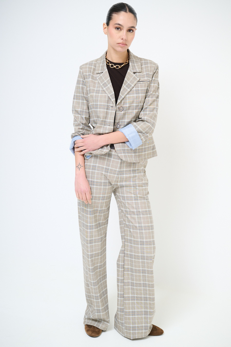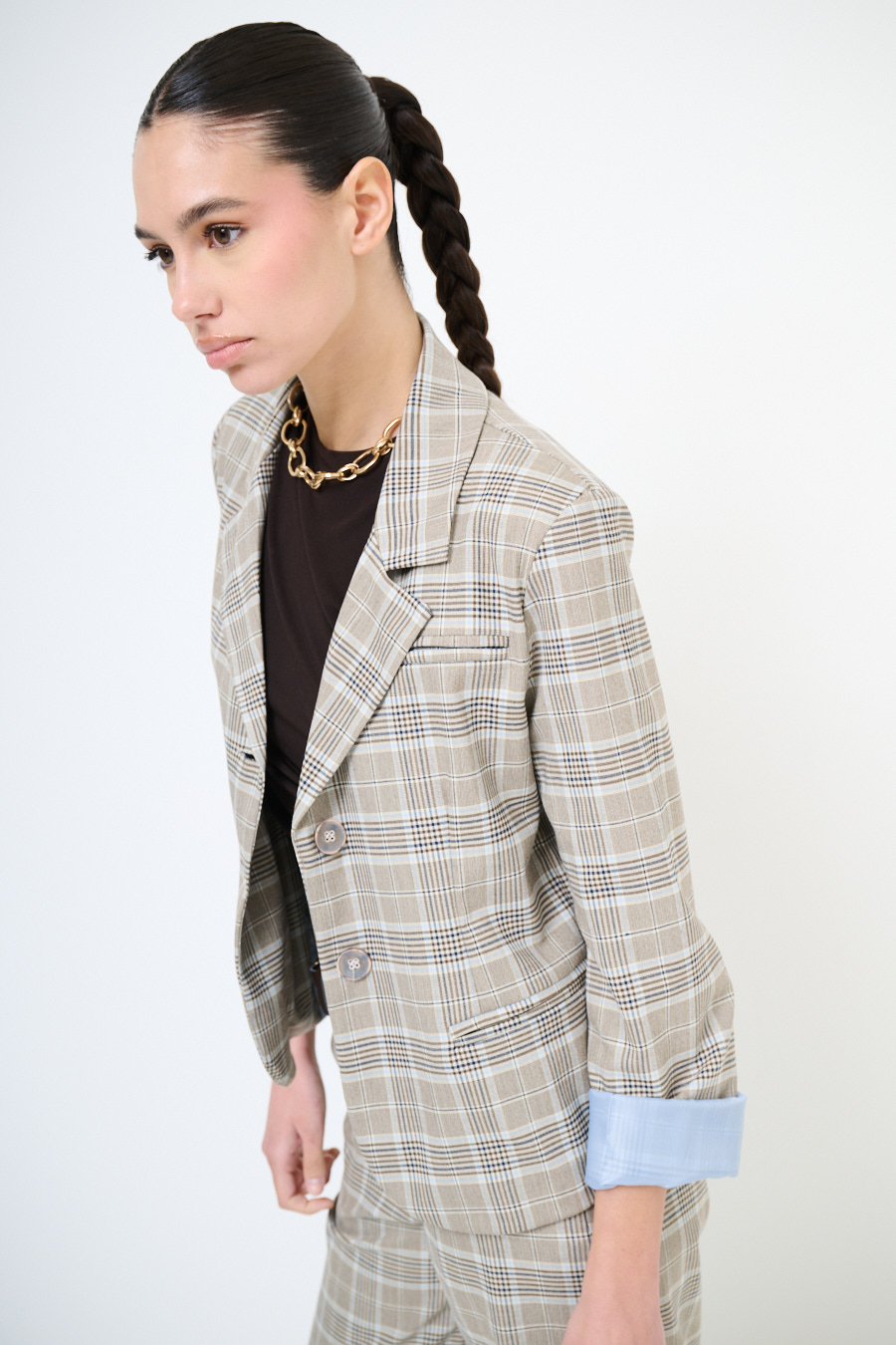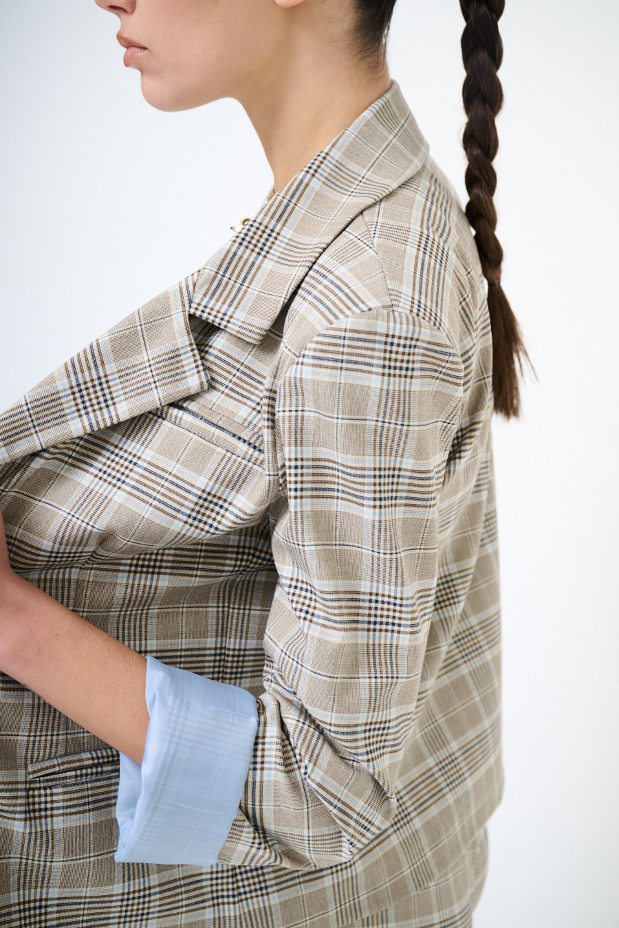 Boxy two-button checked jacket, with faux front pockets and padded shoulder pads, lined inside