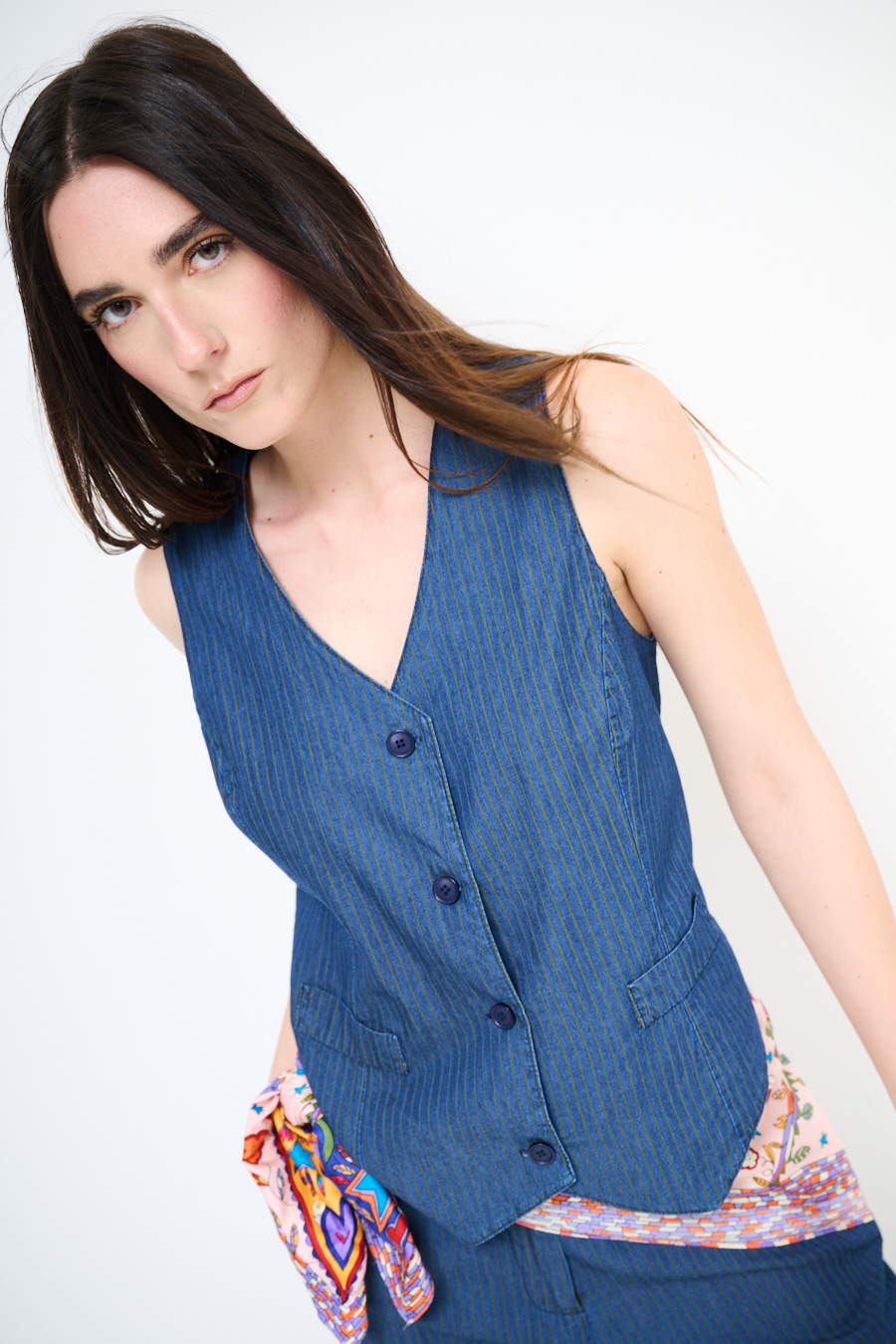 Dark chambray waistcoat with vertical stripes, central buttoning and V-neck