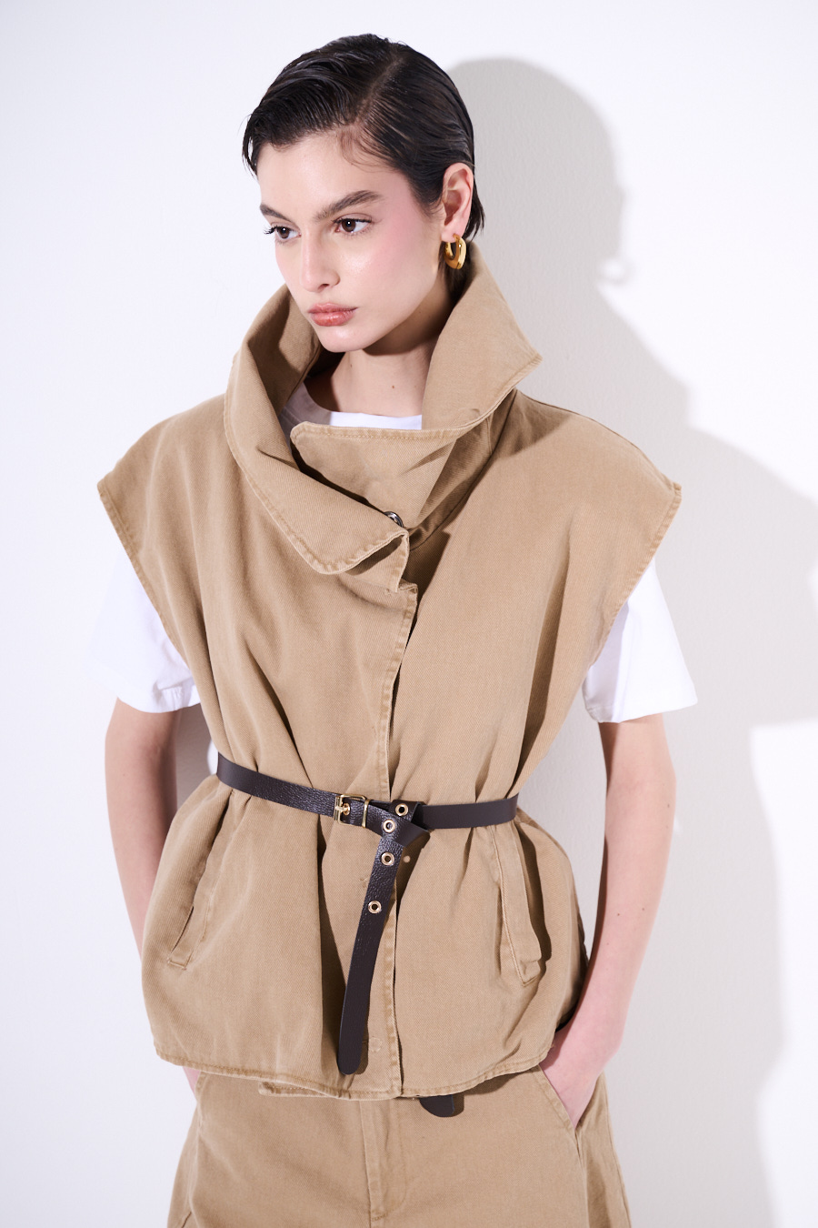 Gabardine gilet with wide stand collar, snap button closure and waist belt