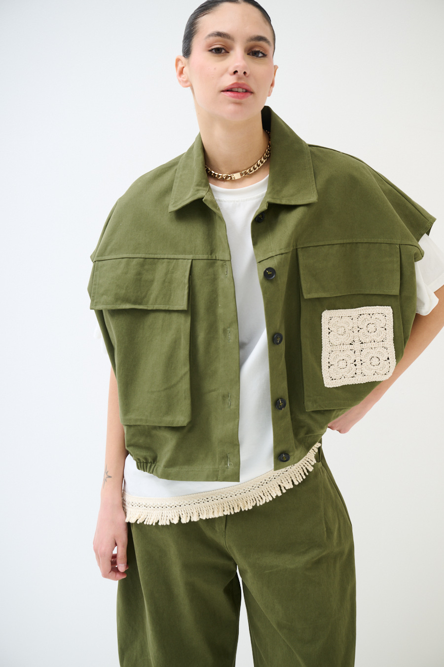 Oversize gabardine vest with maxi front patch pockets with macramé applique, center buttoning and gathered hem