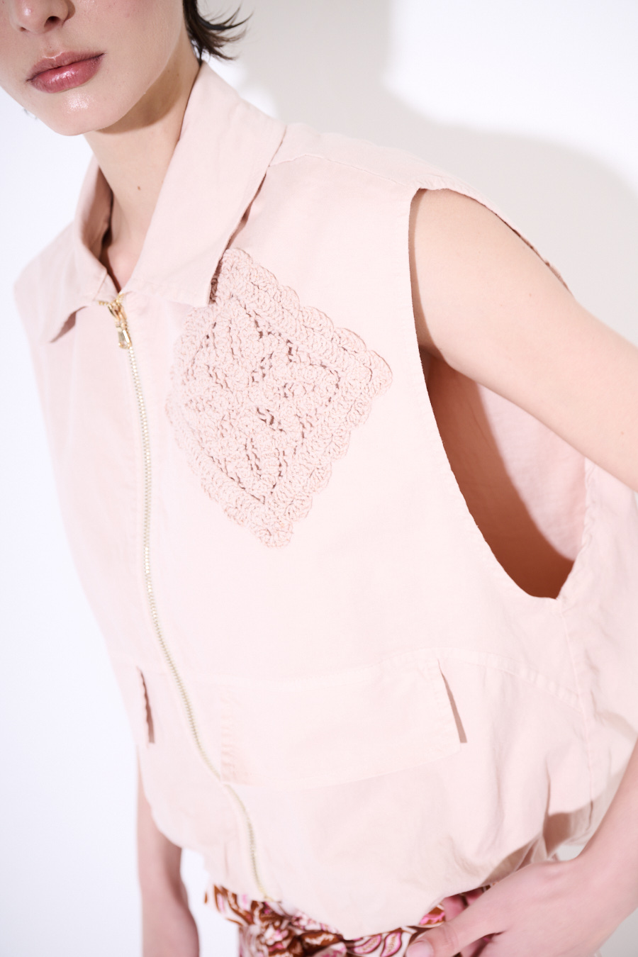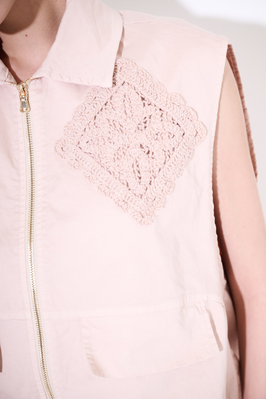Oversize sleeveless gabardine vest with tone-on-tone macramé patch, gathered hem, and internal lining