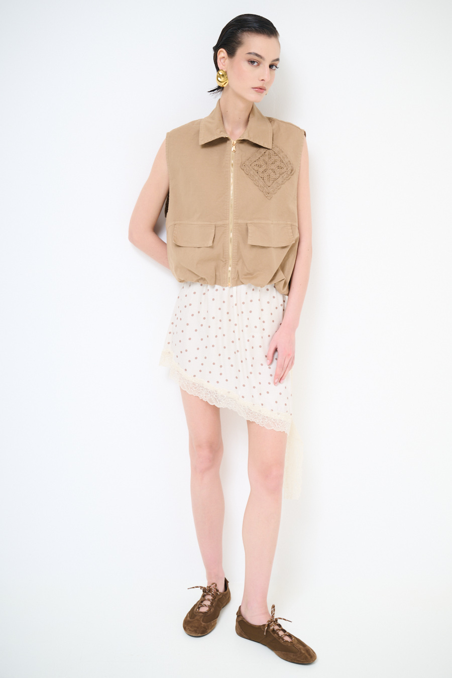 Oversize sleeveless gabardine vest with tone-on-tone macramé patch, gathered hem, and internal lining