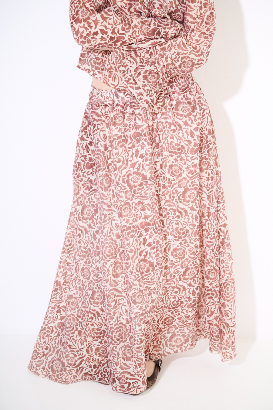 Full-circle long skirt with printed pattern, elastic waist, and internal lining