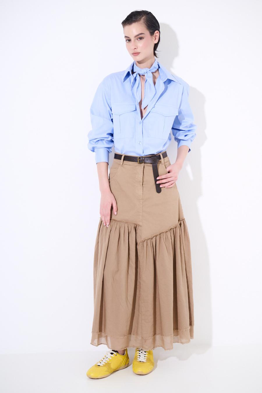 5-pocket midi skirt with cotton muslin hem and macramé patch on the back, with belt loops at waist