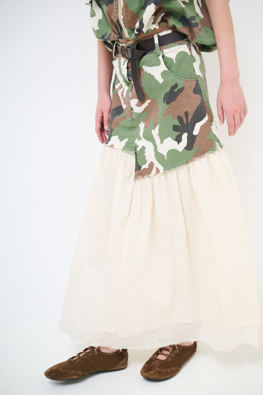 Camouflage 5-pocket midi skirt with contrasting cotton muslin hem and macramé patch on the back, with belt loops at waist