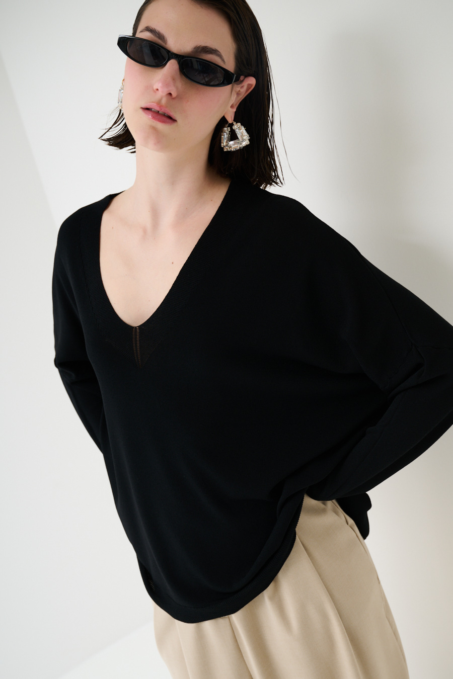 Oversized viscose top with deep V-neck and side slits