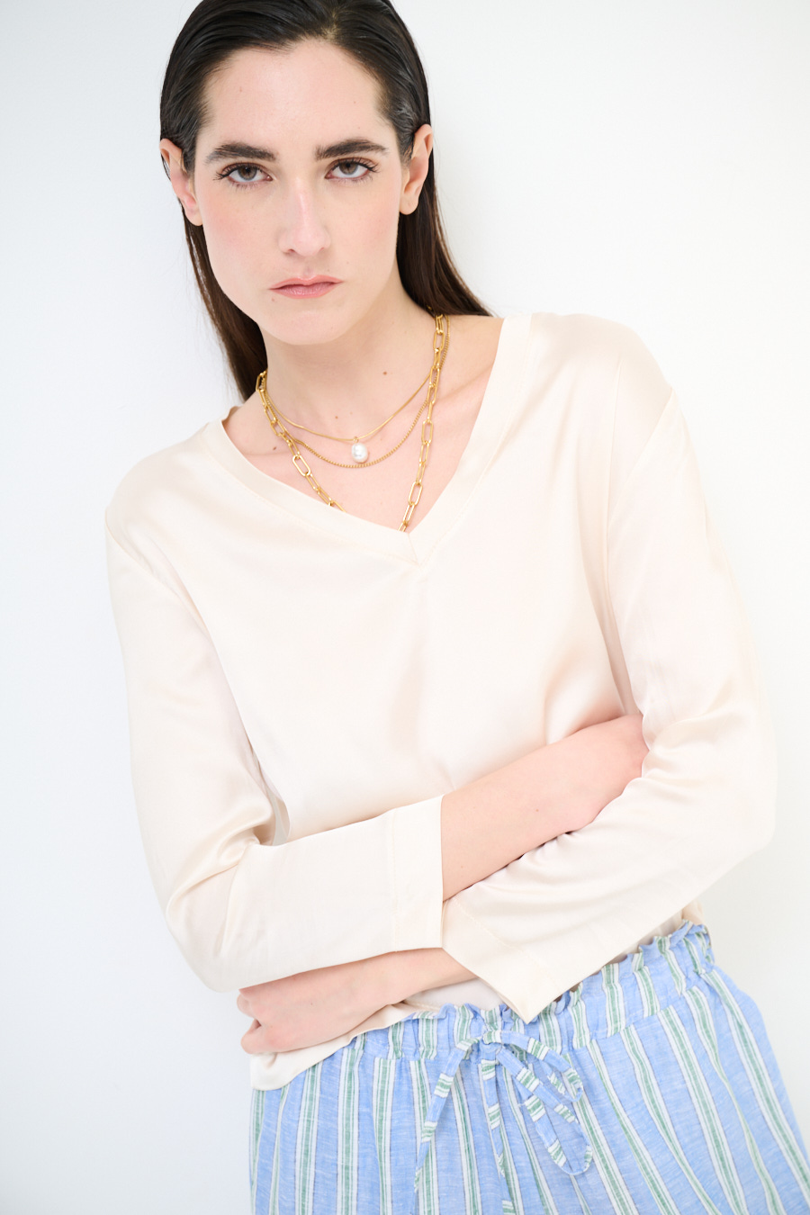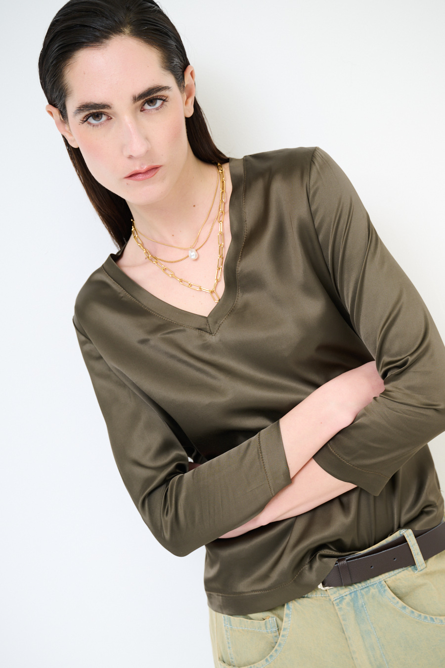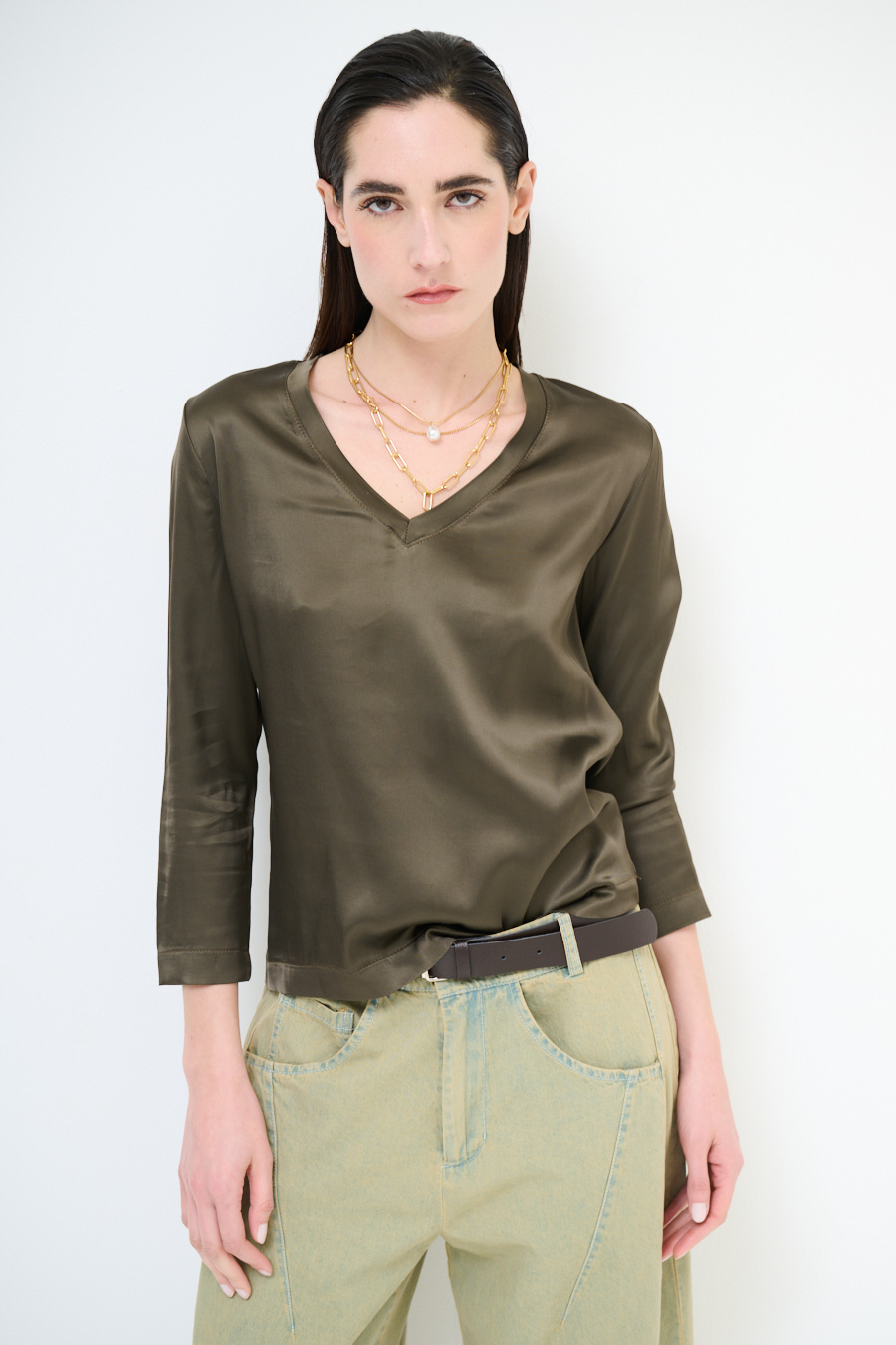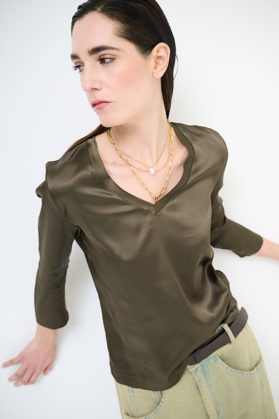 Viscose satin jacket with wide V-neck and 3/4 sleeves
