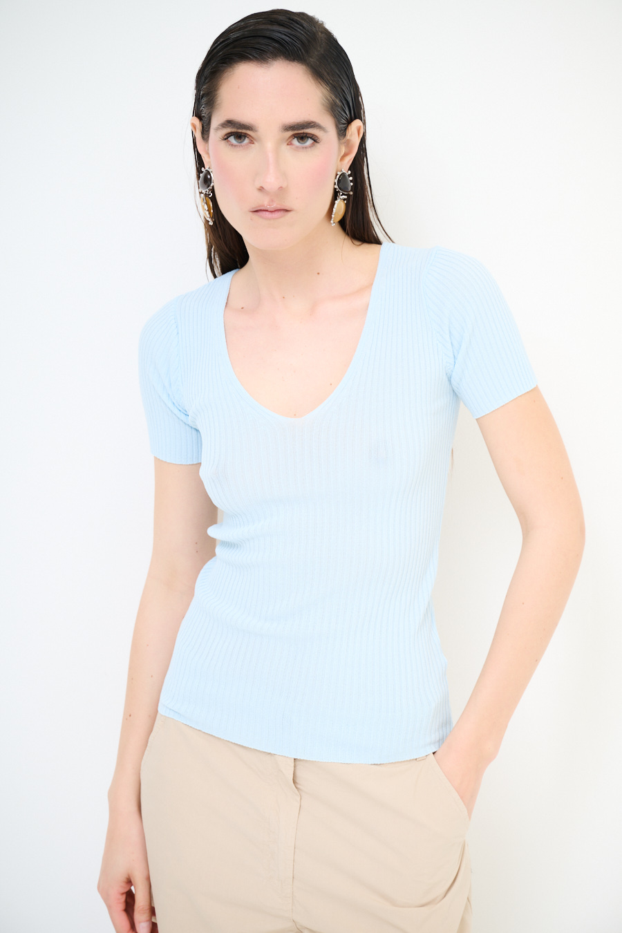 MAGLIA SCOLLO V A COSTINE E MEZZA MANICA CELESTE