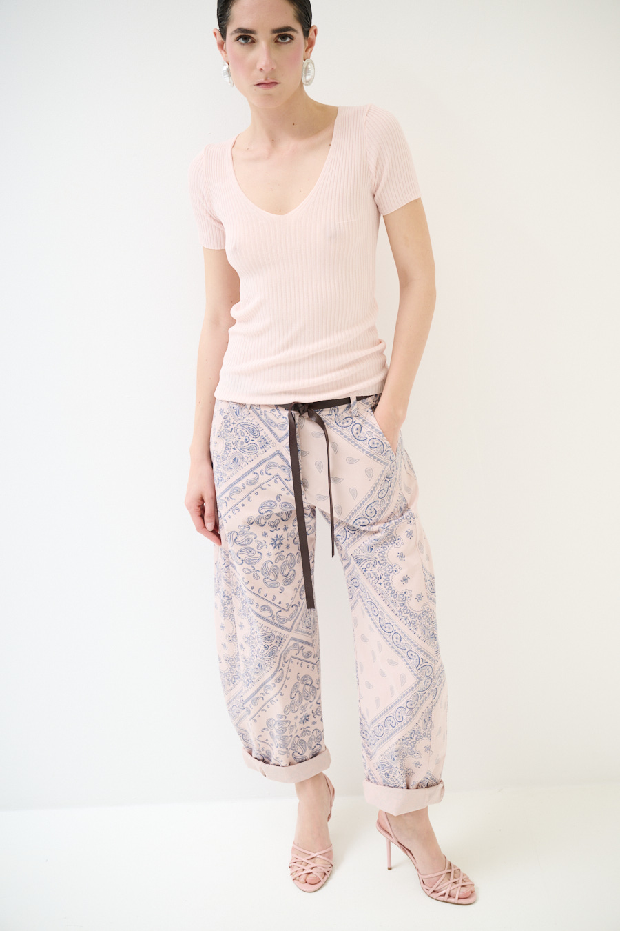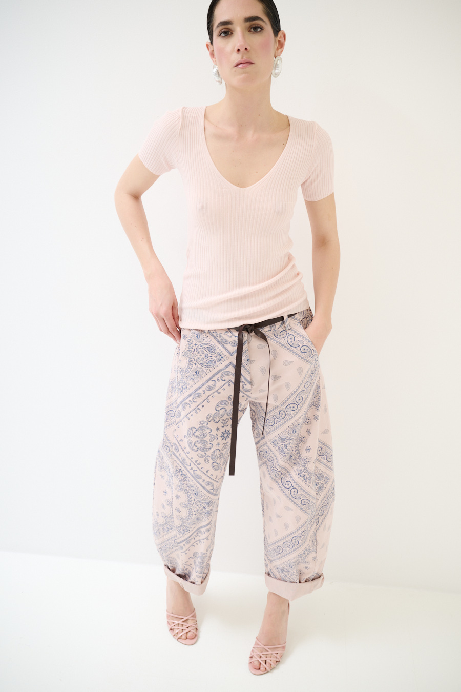 Pantalone balloon fit in gabardina leggera con stampa bandana, elasticizzato sul retro e con cintura