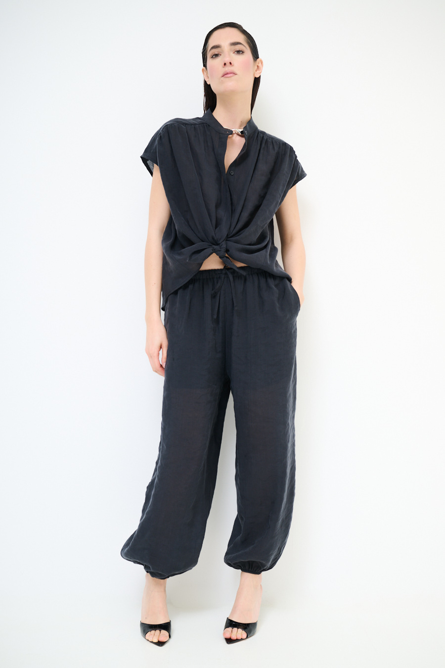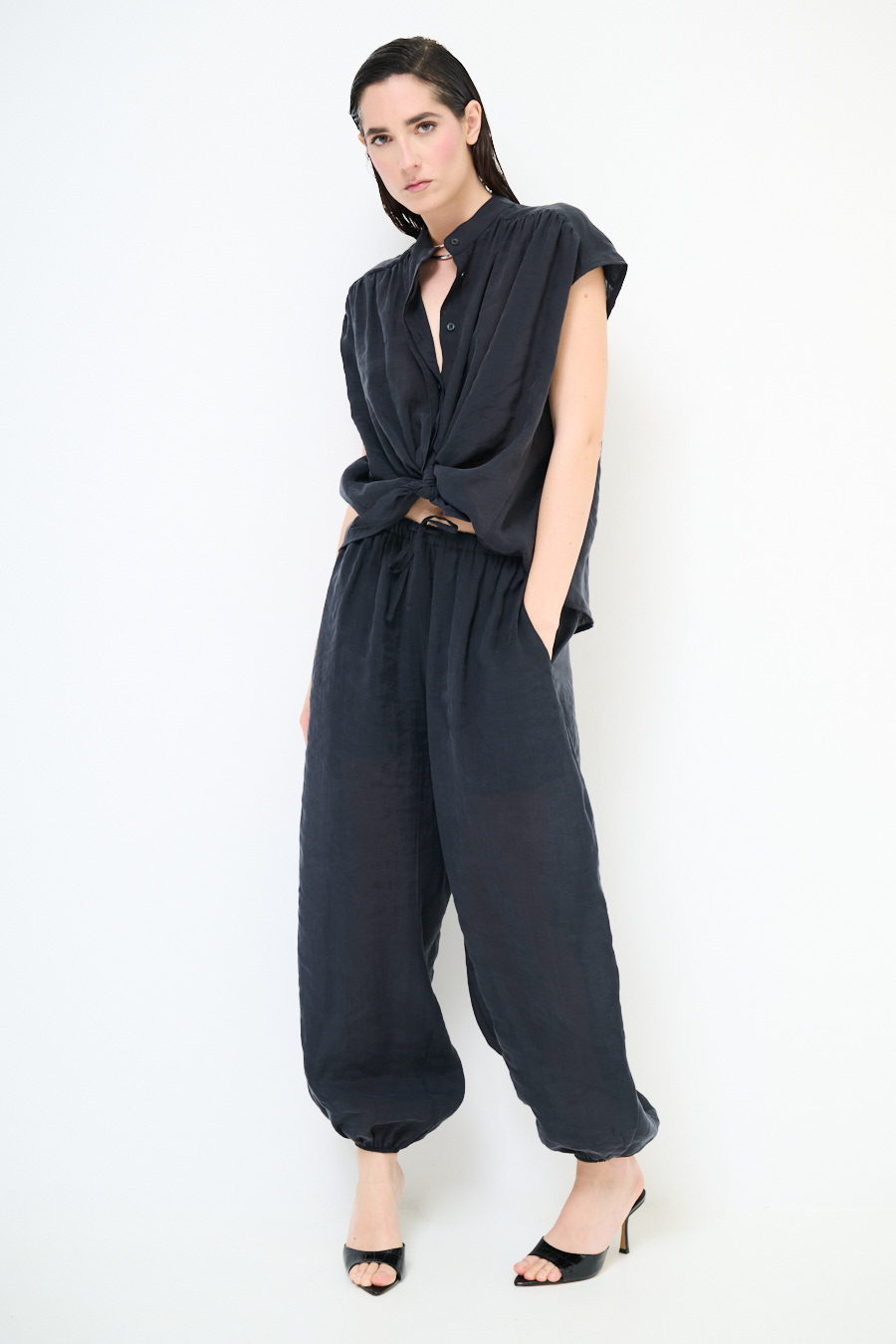 Pantalone balloon fit in lyocell leggero con fodera a short e con elastico sul fondo e coulisse in vita