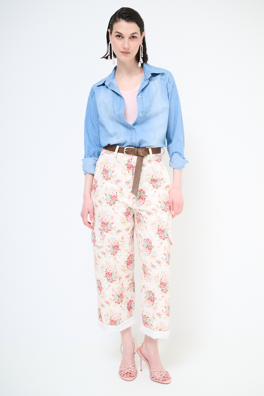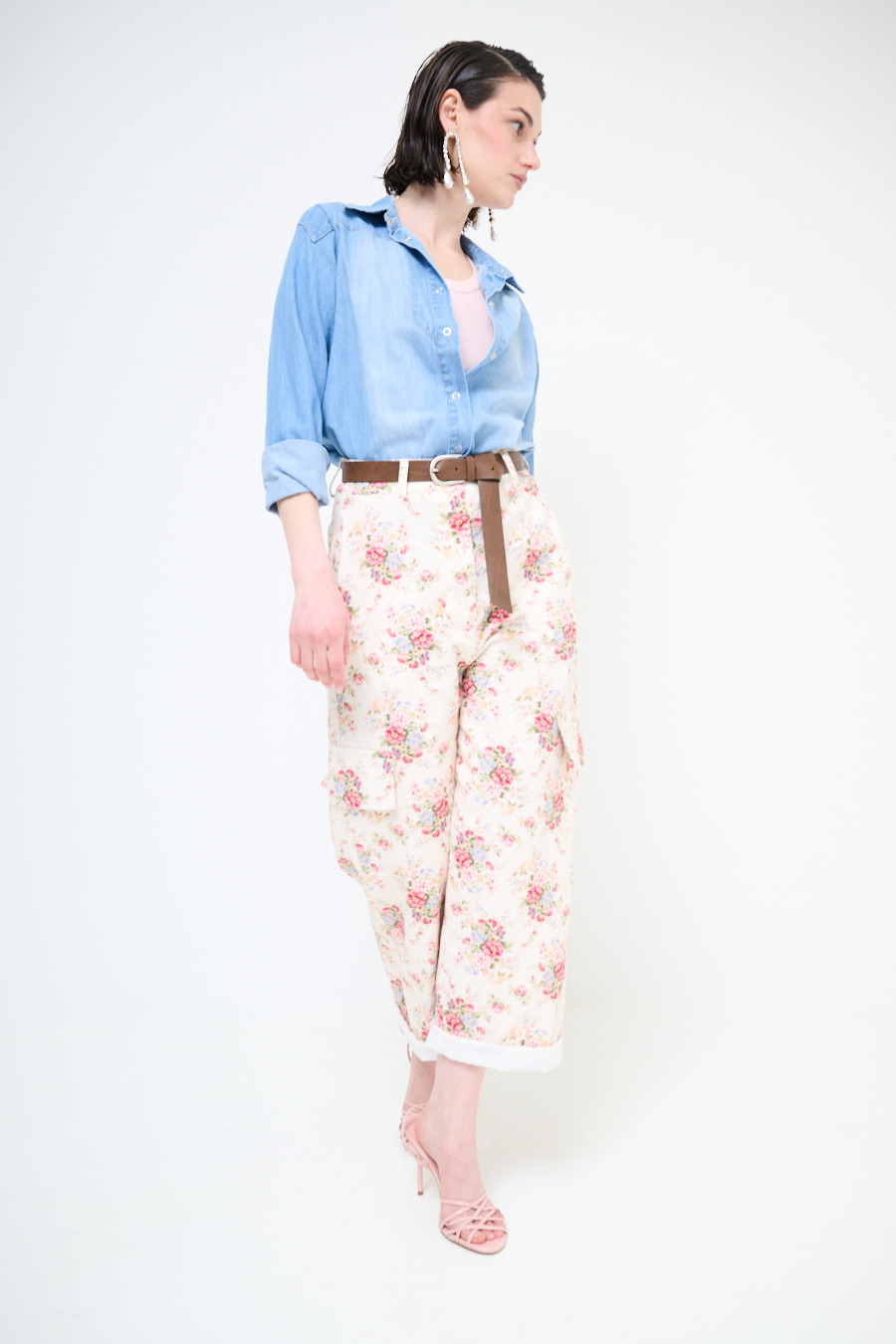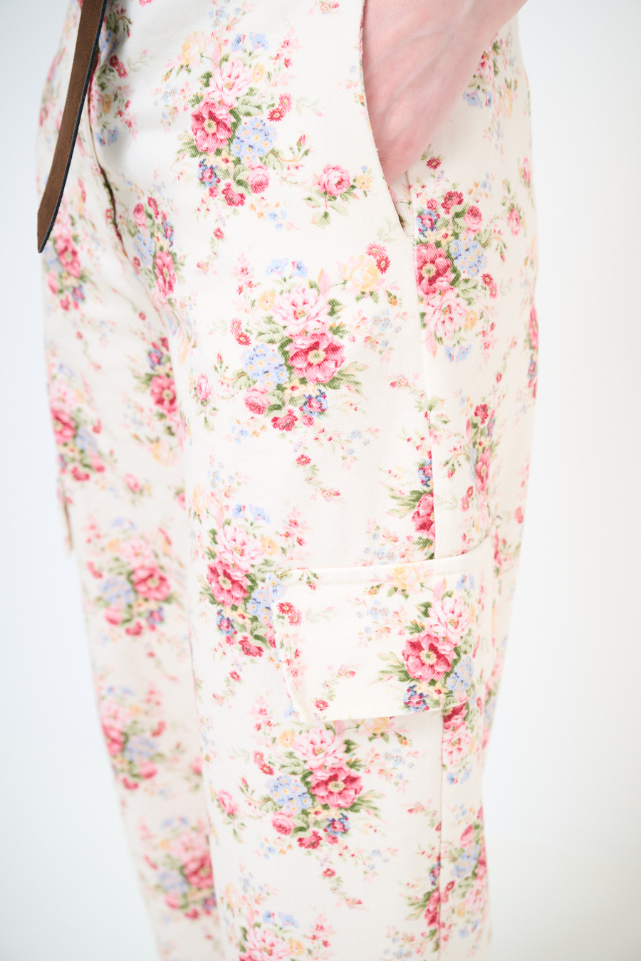 Balloon trousers in cotton gabardine with floral print, faux fly, side pockets and waist belt