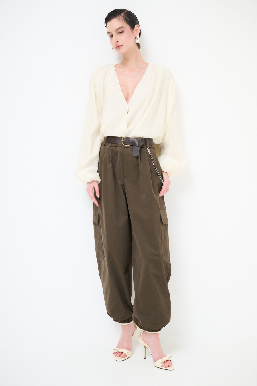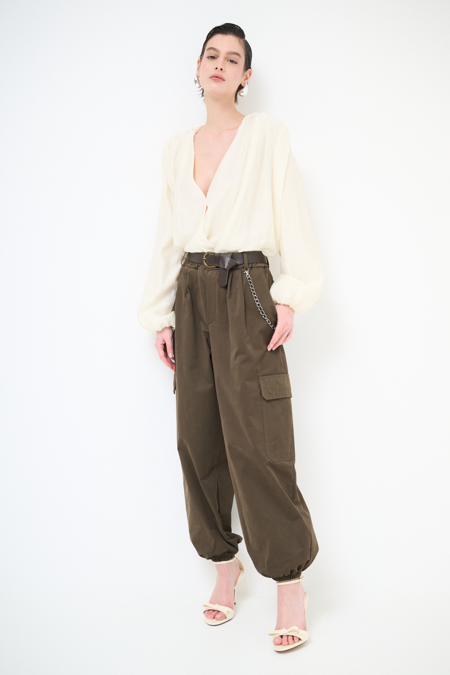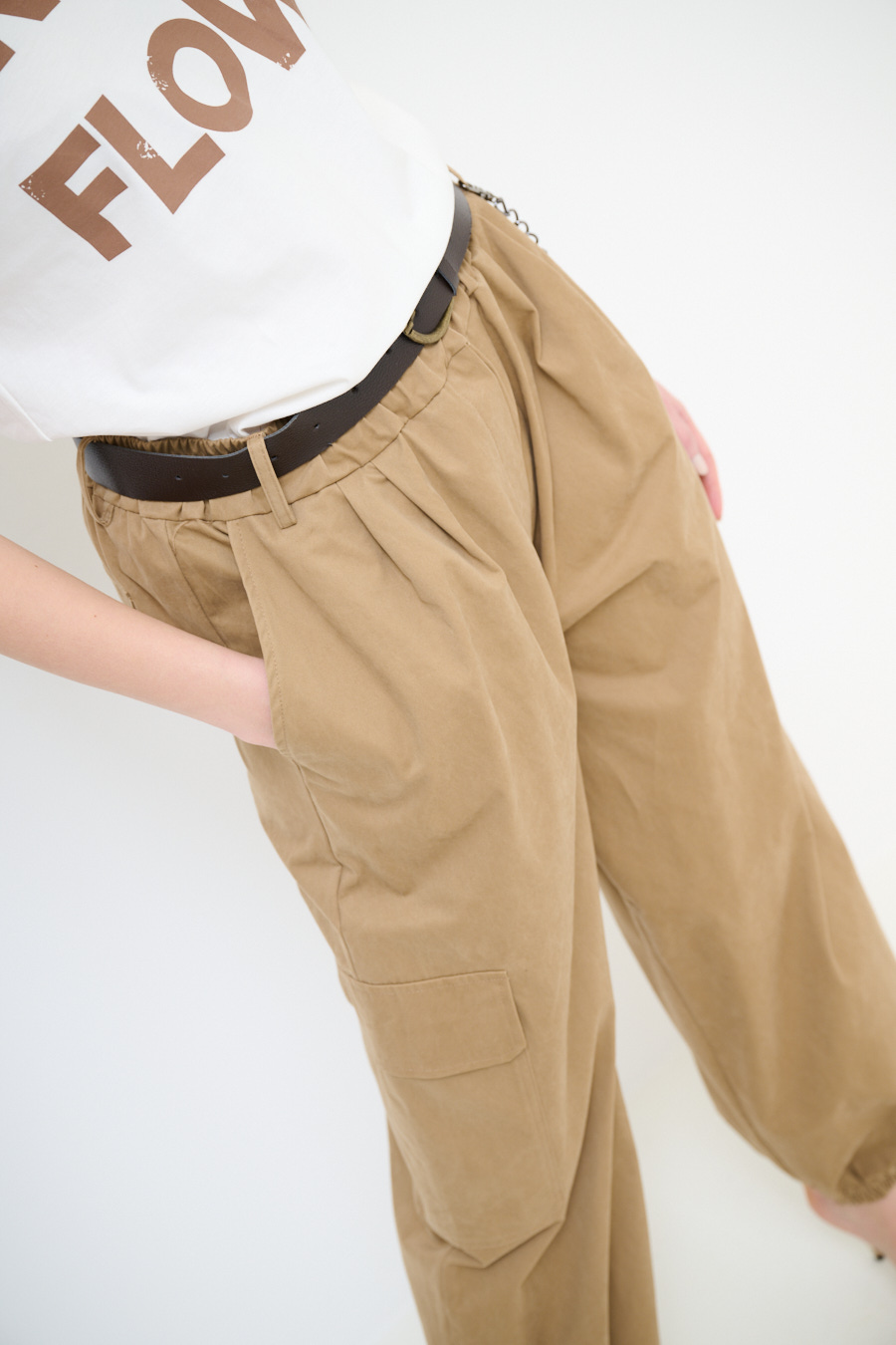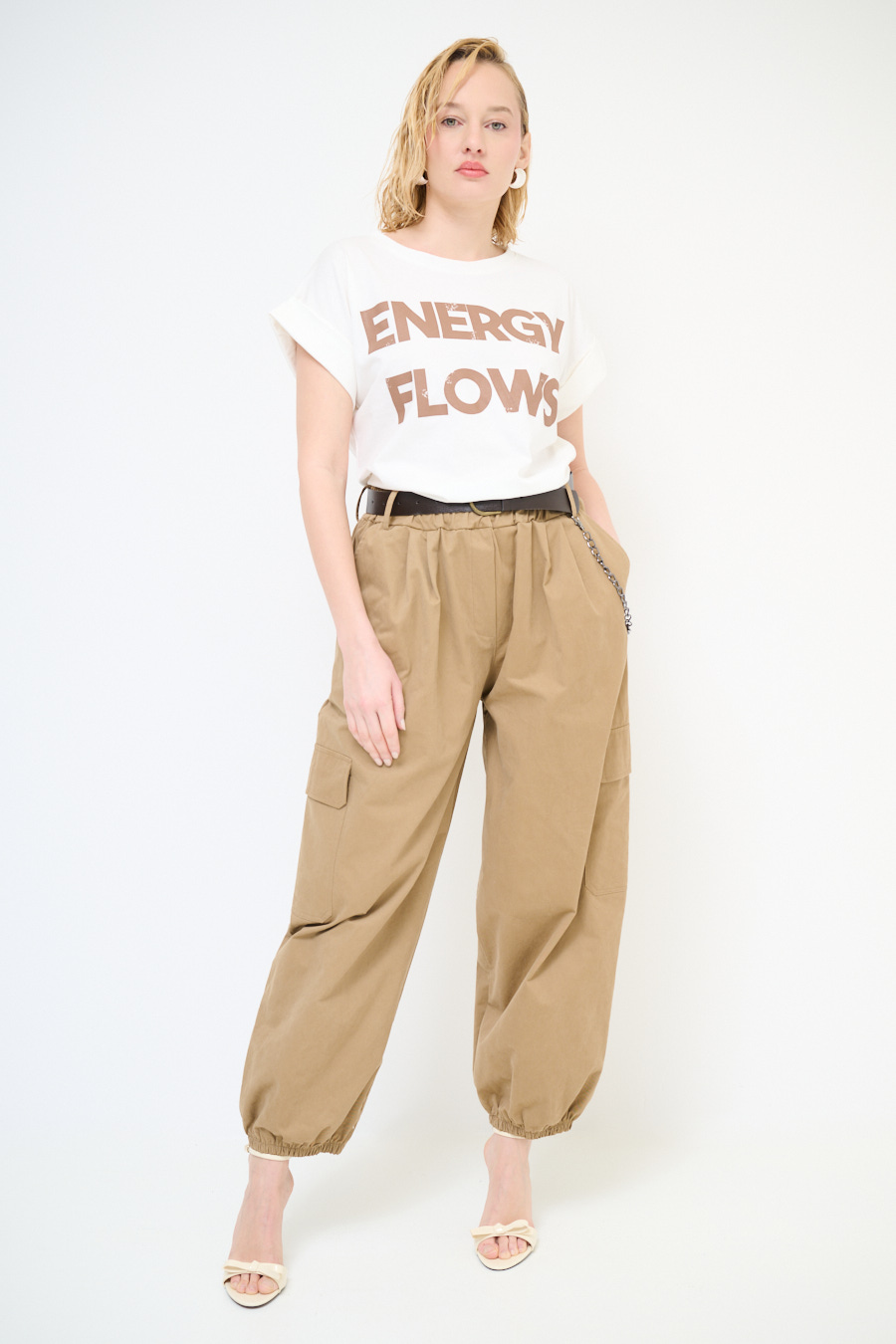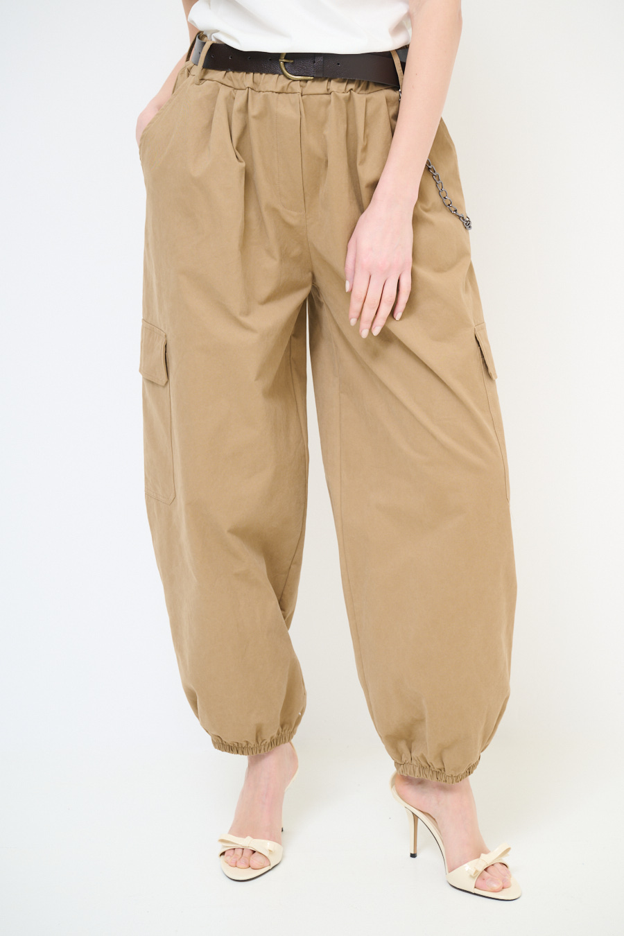 Wide cargo trousers with ankle elastic, large side pockets and belt, elasticated waist and chain on the belt loops