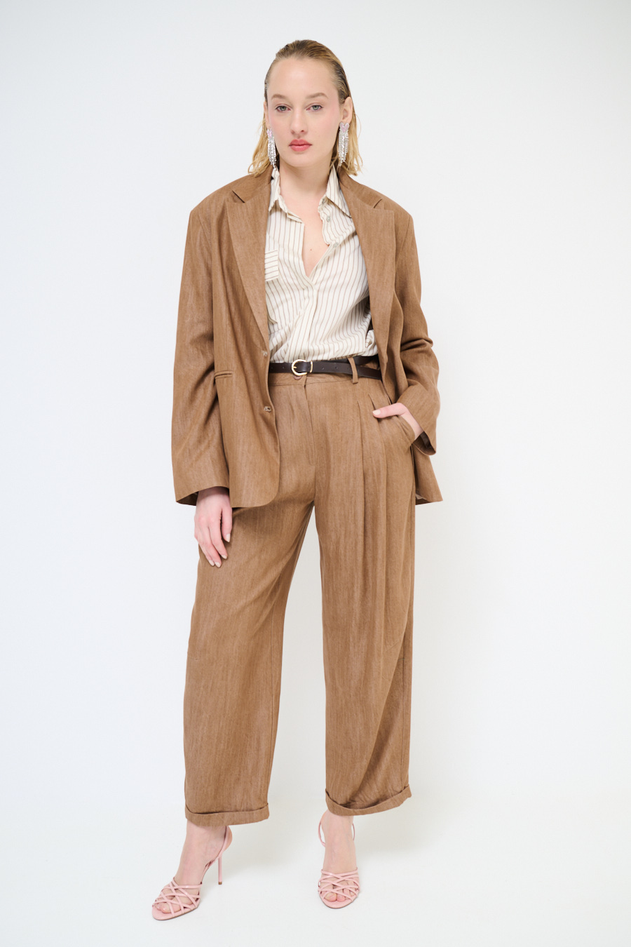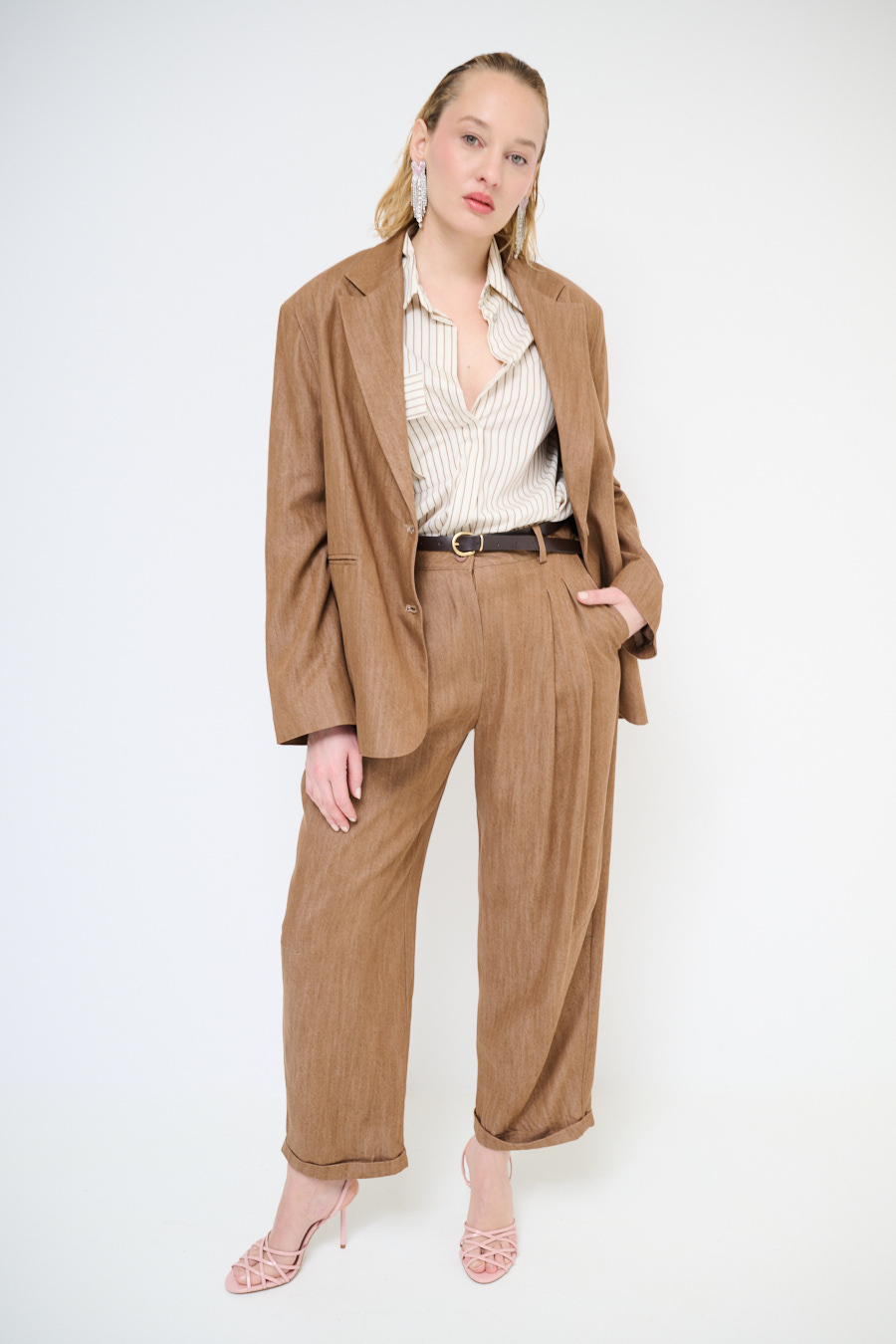PANTALONE CON MULTI PINCES E CINTURA CAMMELLO