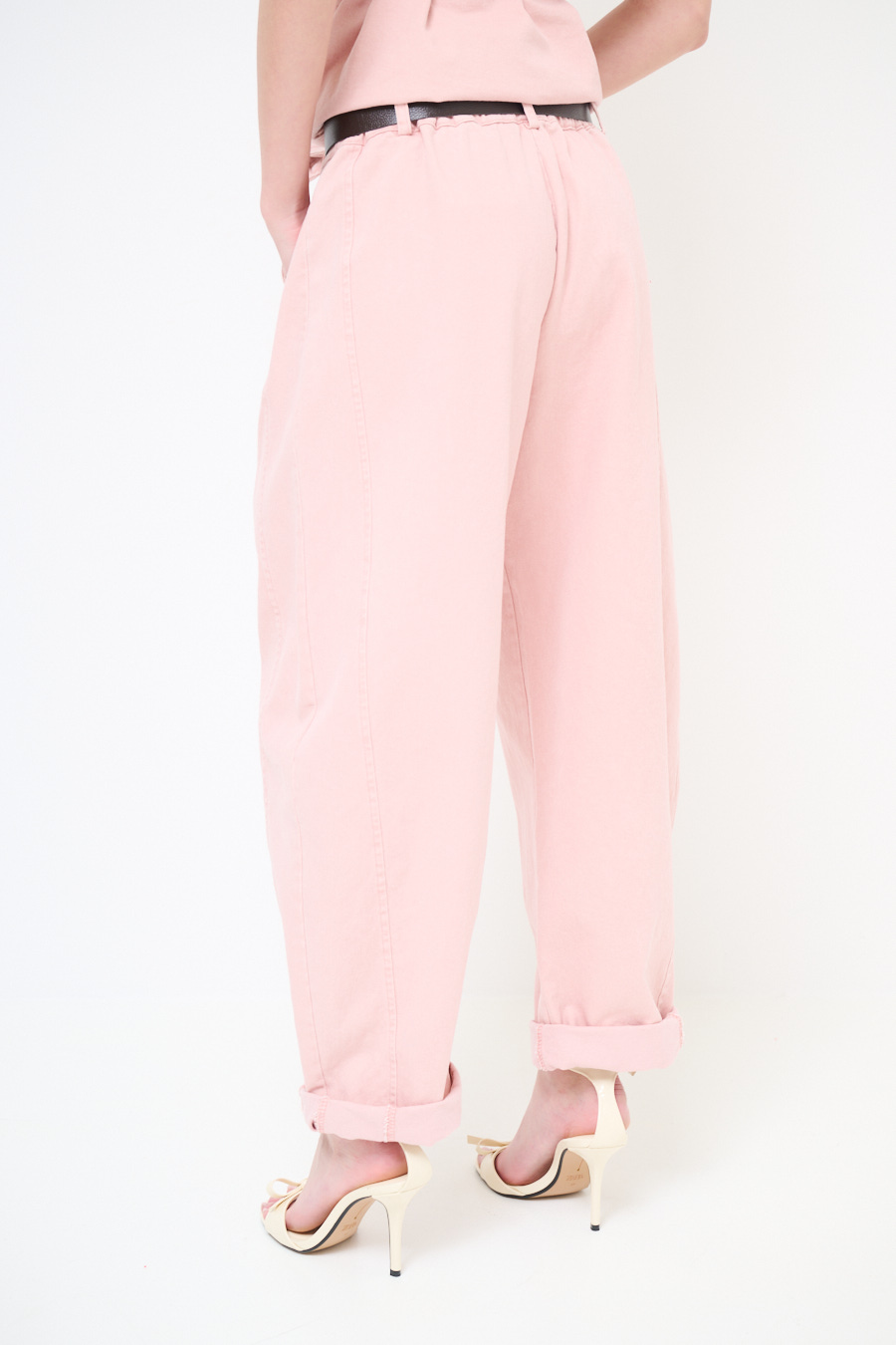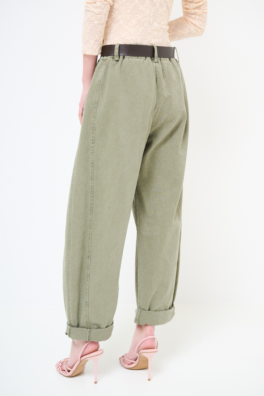 Egg-shaped drill cotton trousers with washed effect, front seam and pockets. With waist belt and elastic at the back
