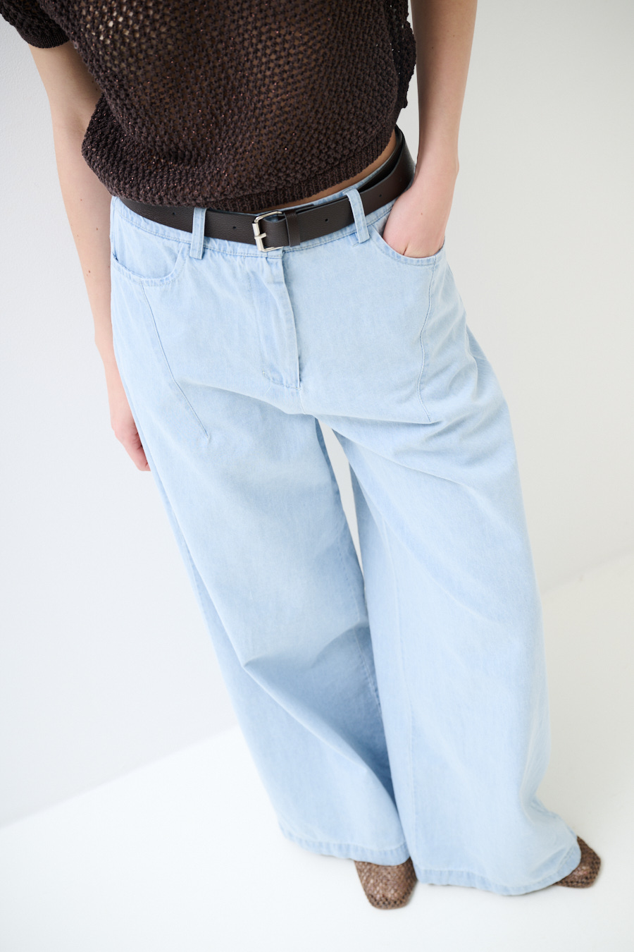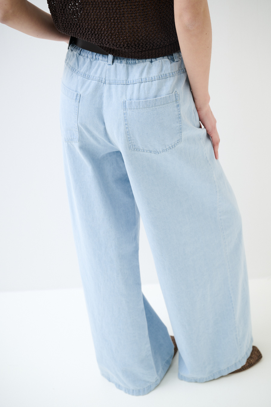Light-wash denim palazzo pants with stitched darts and waist belt