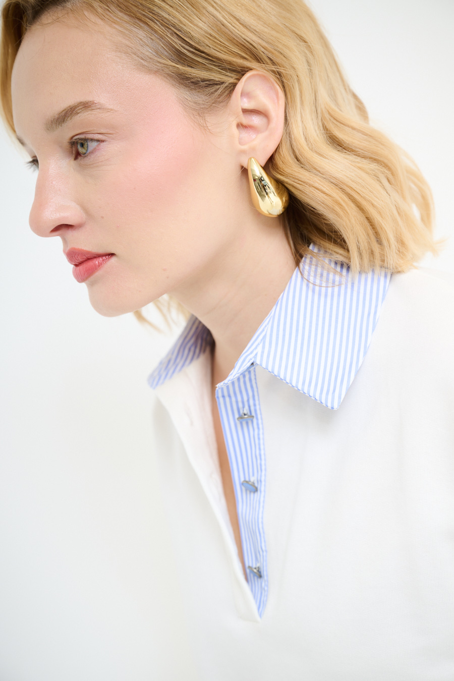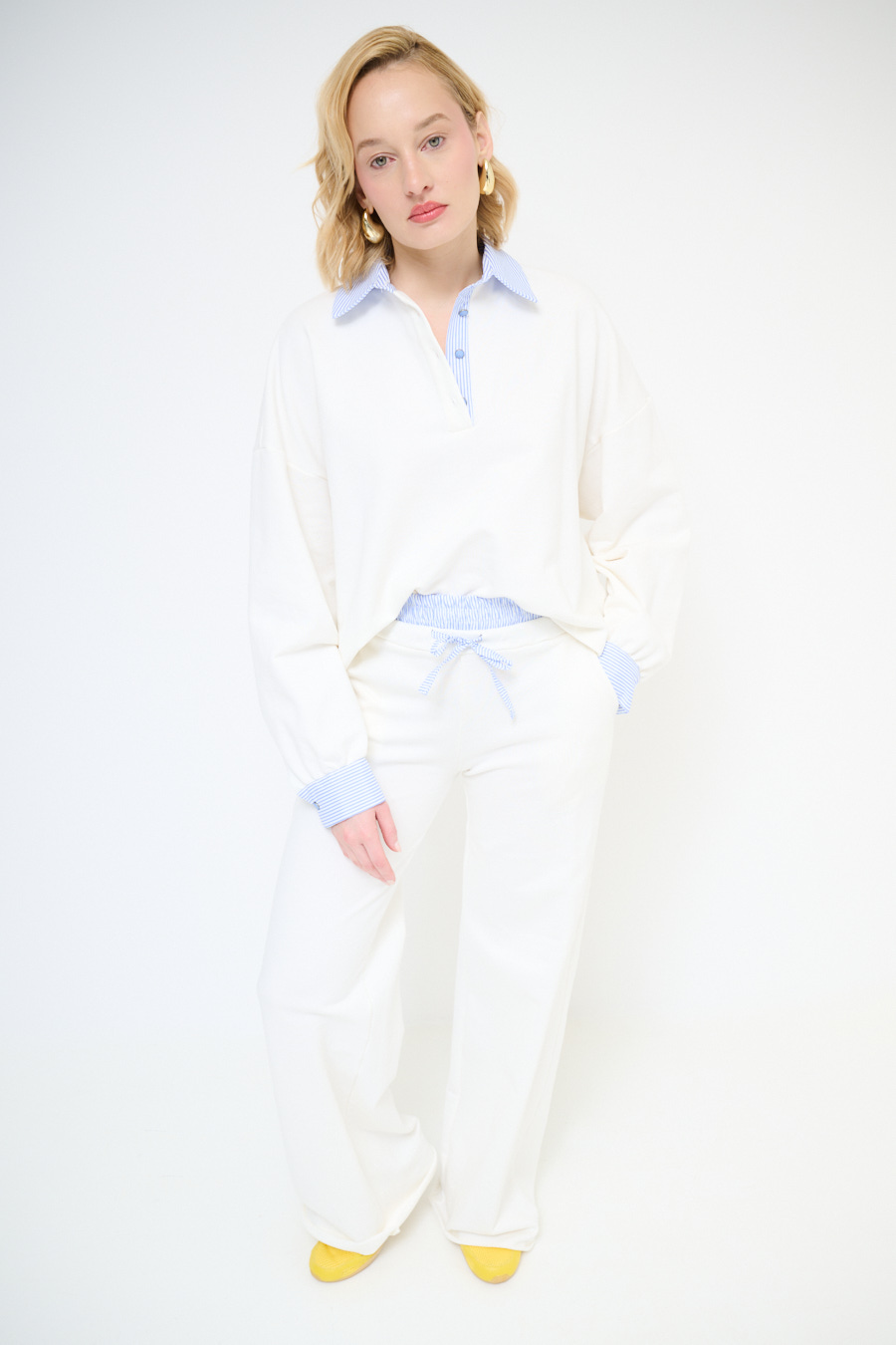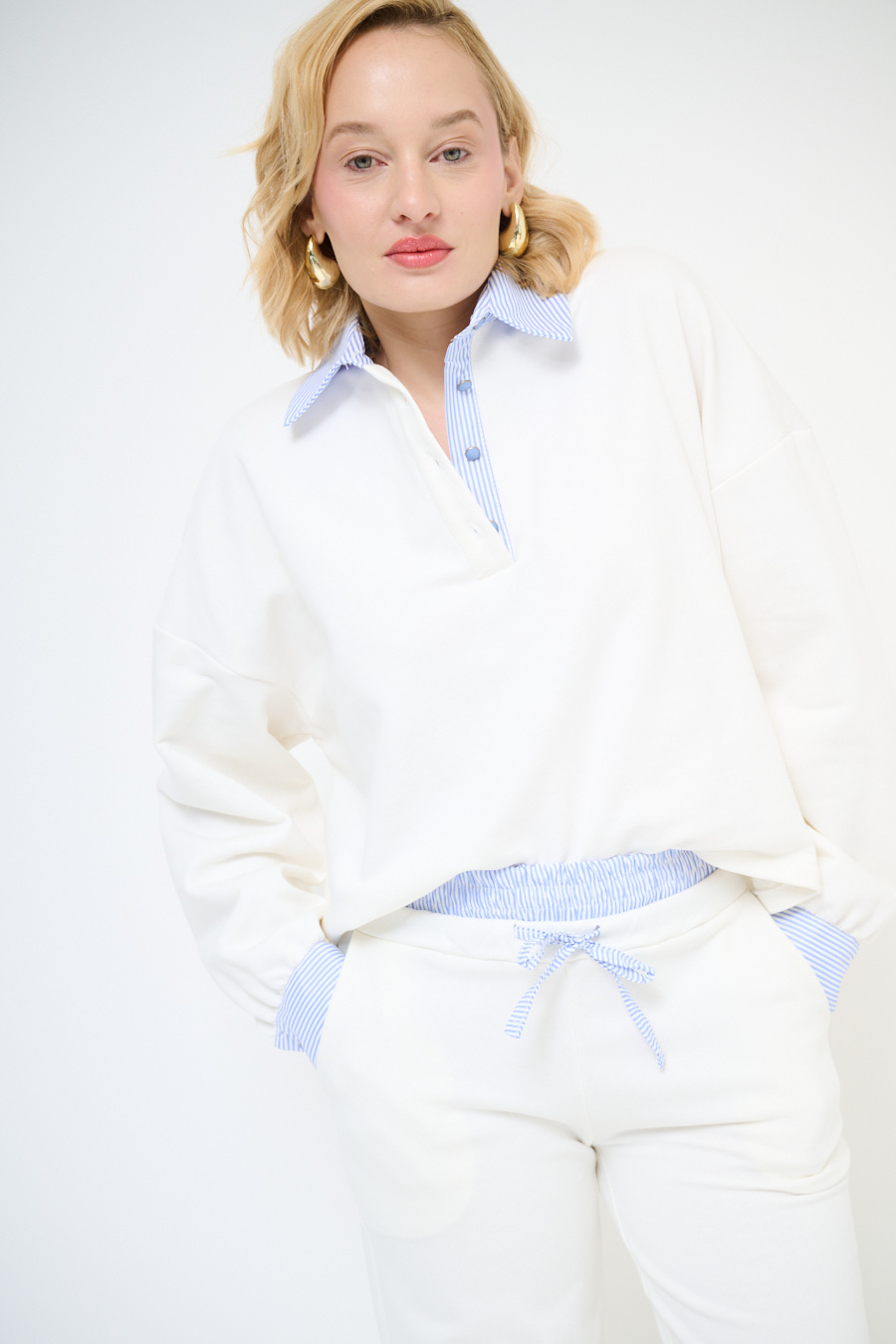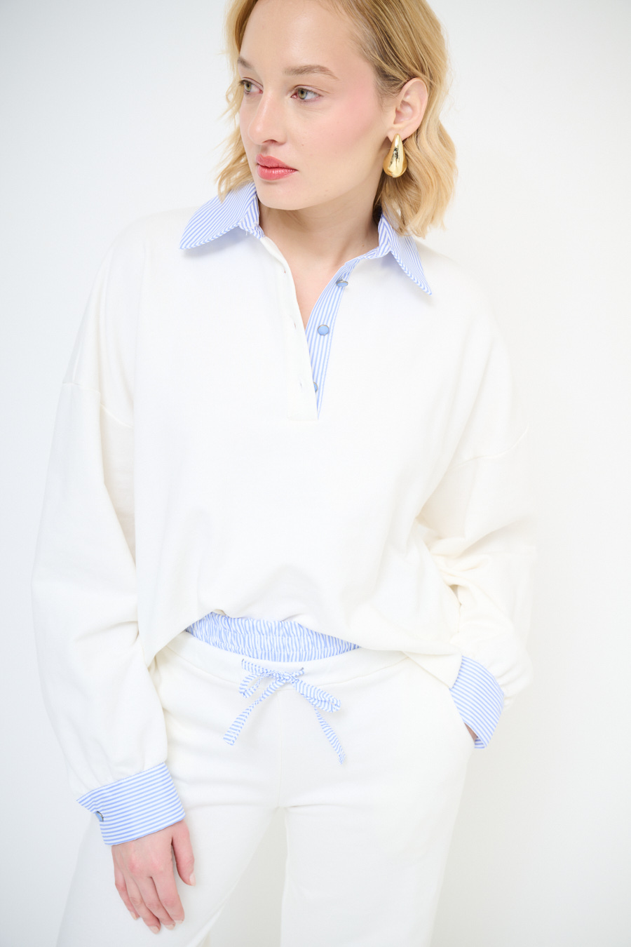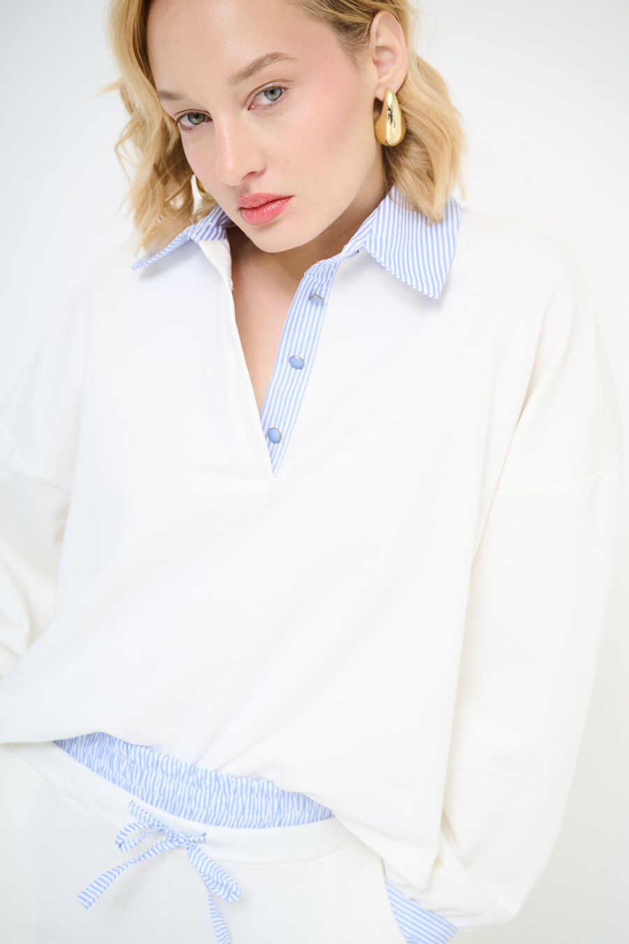 Brushed polo sweatshirt with dropped shoulder and striped poplin collar and cuff