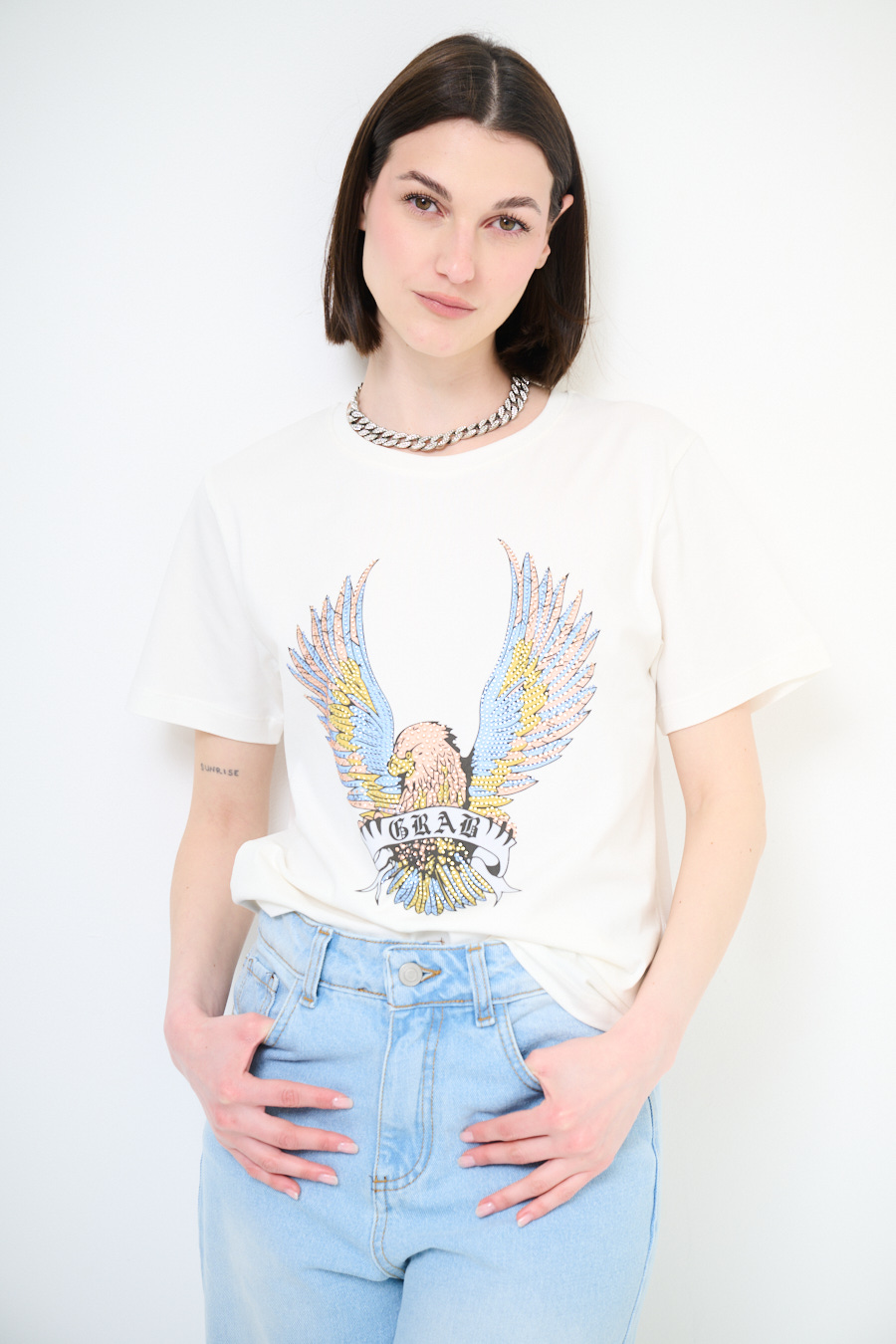 Basic crew neck T-shirt with Eagle print and rhinestones